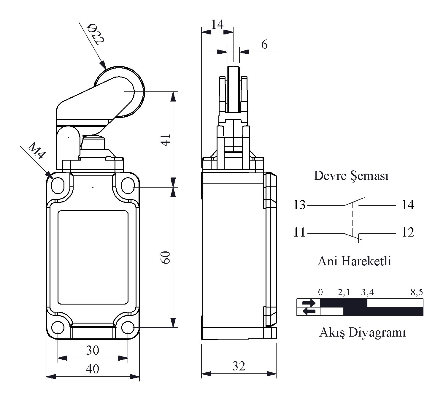 L52 Metal Body 22 mm Metal Roller Lever Snap Action 1NO+1NC Limit Switch