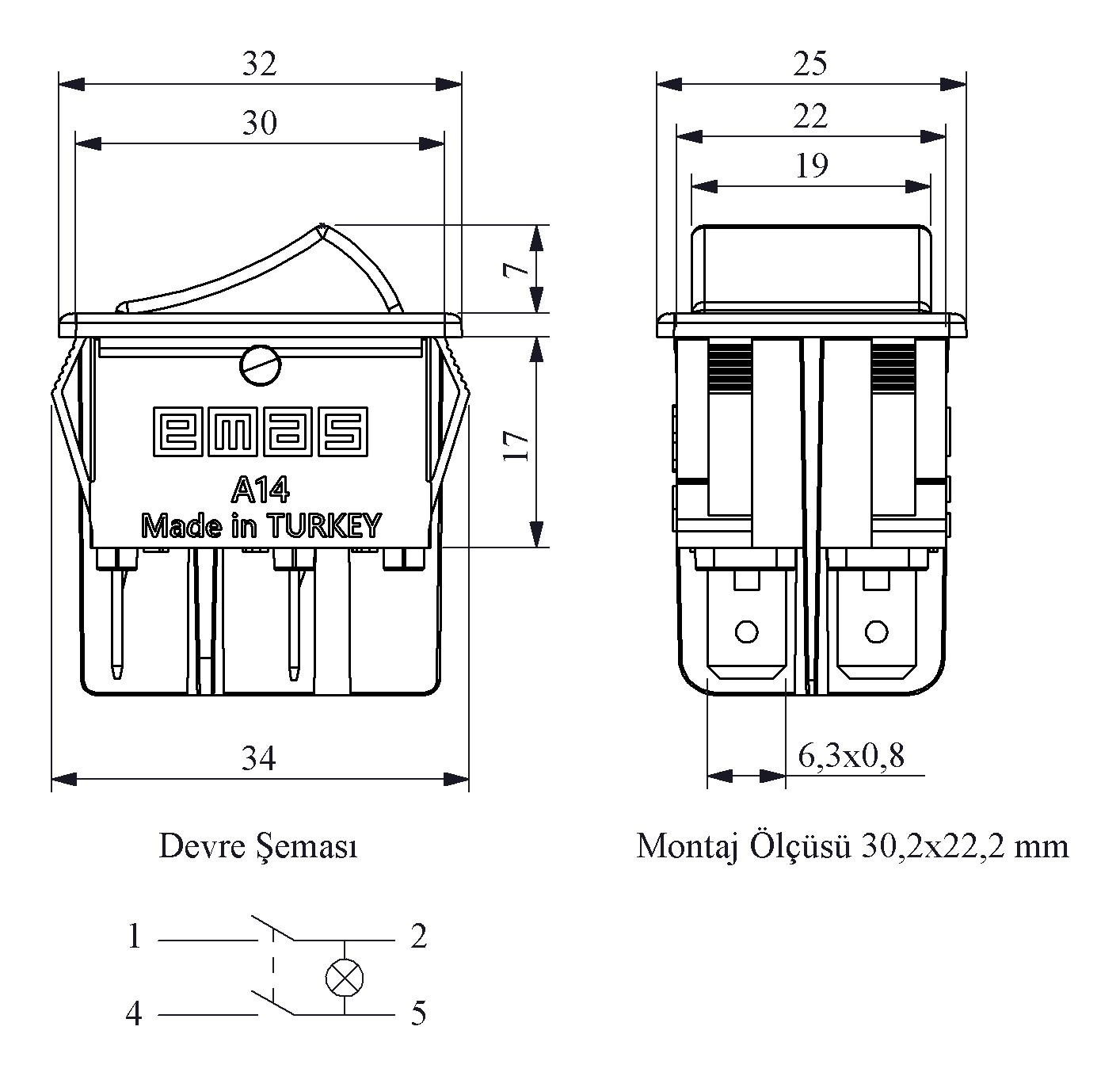 30*22mm Black Body 2NO with Illumination with Terminal (0-I) Marked Red A14 Series Rocker Switch