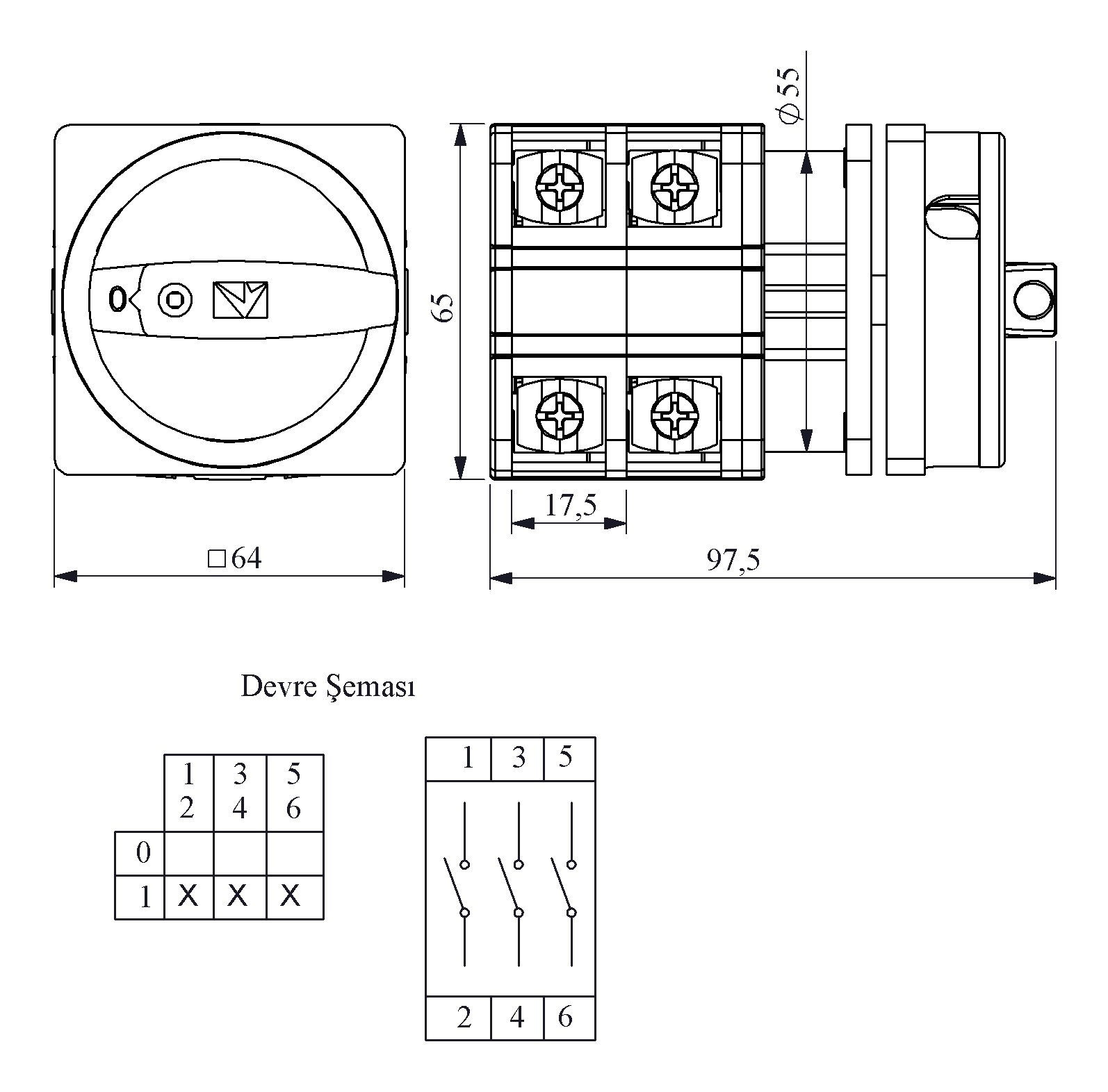 50A On-Off 3 Phase (0-1) 90°  Safety 64*64 Cam Switch