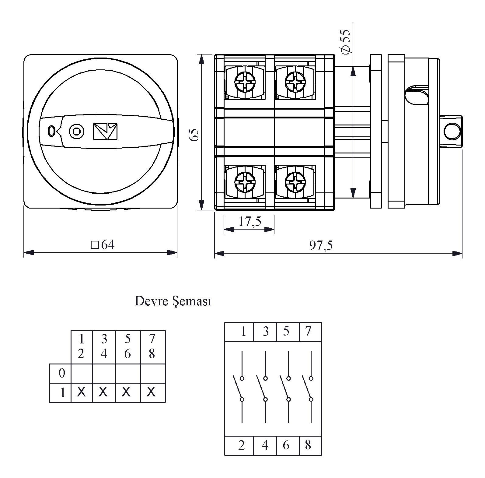 50A On-Off 3 Phase+Neutral (0-1) 90° Safety 64*64 Cam Switch