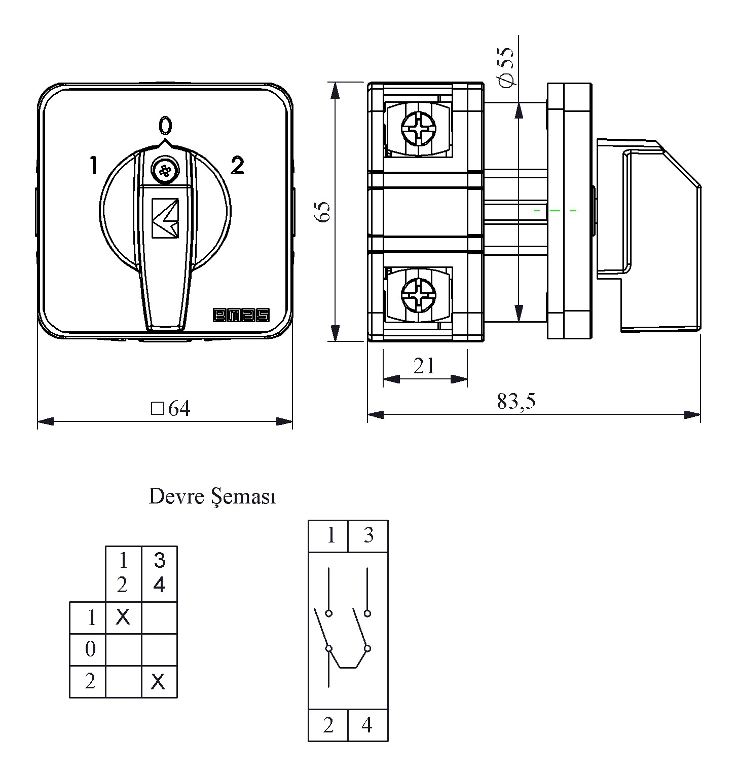 63A Changeover 1 Poles (1-0-2) 60° 64*64 Cam Switch