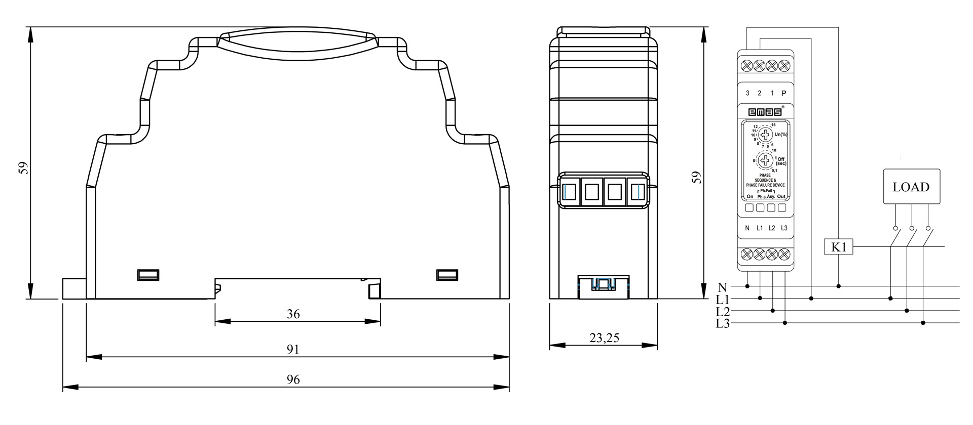 RR3 SeriesRail Mount 230VAC 1CO 10A (rezistif) Phase Sequence %5-%15 Analog Motor Protection Electronic Relay