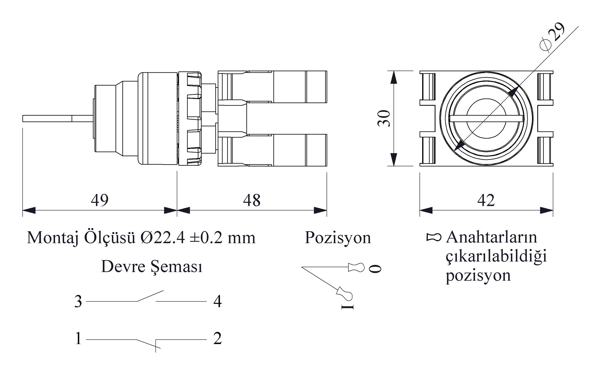 B Serisi Plastik 1NO+1NC (0-I) 60° Anahtarlı Kalıcı Tüm Pozisyonlarda Anahtarı Çıkan 22 mm Buton