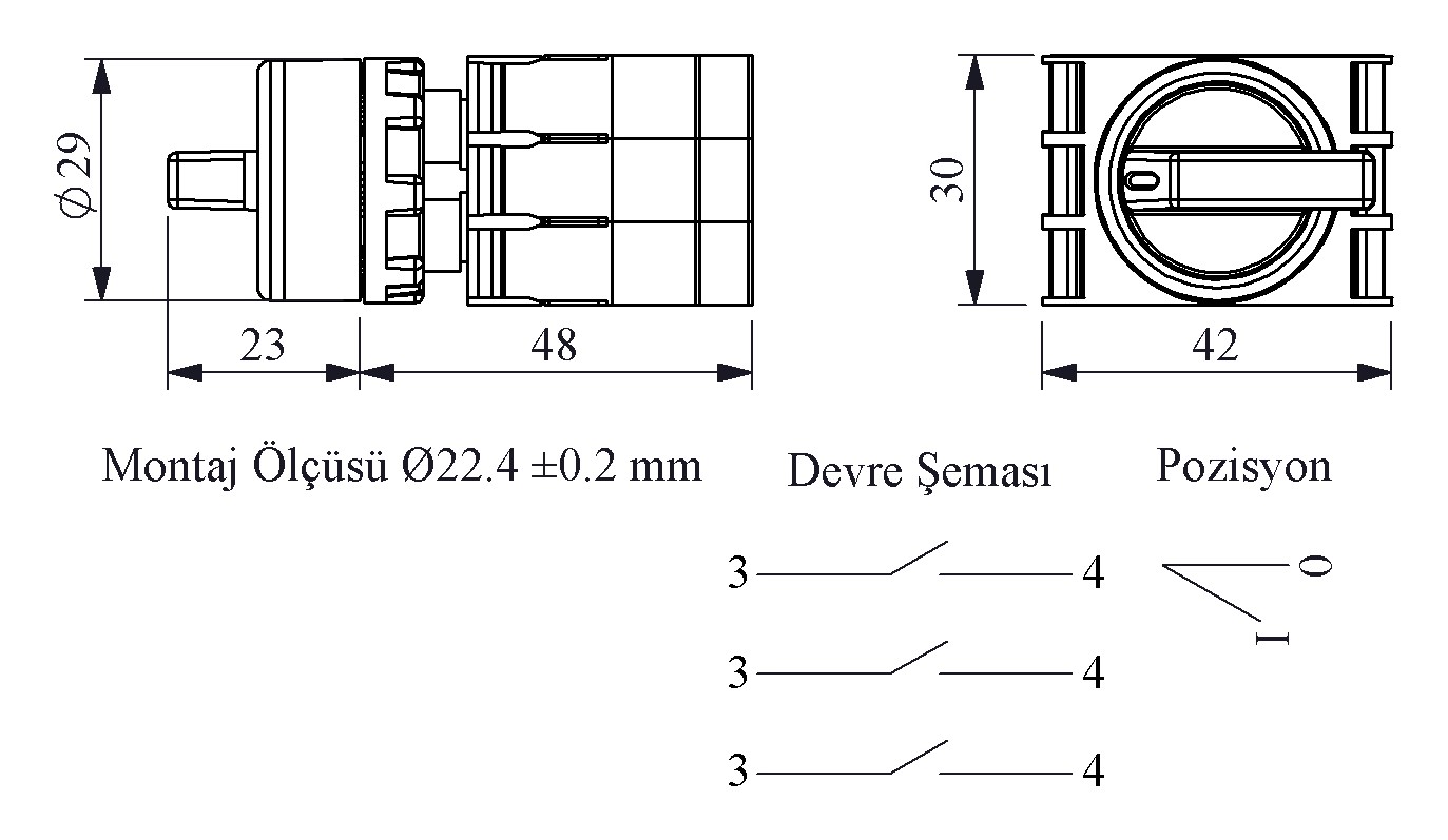 B Serisi Plastik 3NO (0-I) 60° Seçici Kalıcı 22 mm Buton