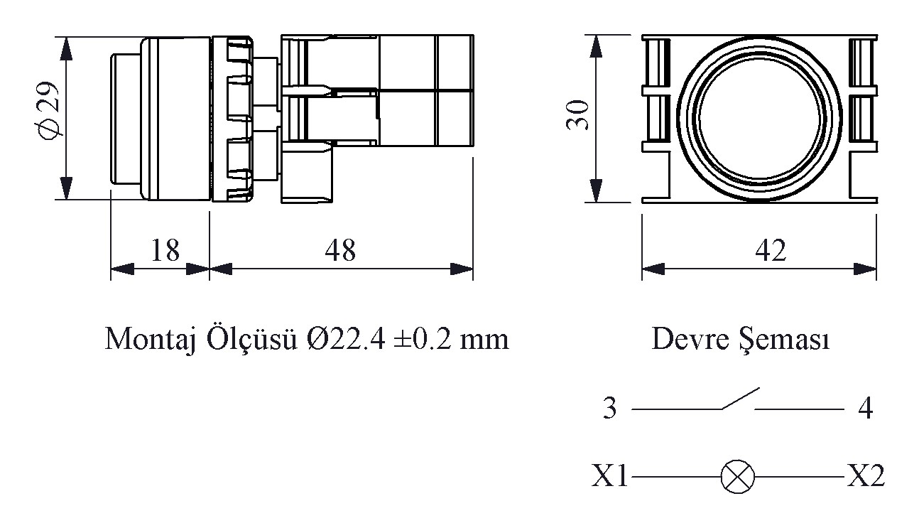B Serisi Plastik Ba9S Duylu 1NO Yaylı Çıkık Yeşil 22 mm Buton