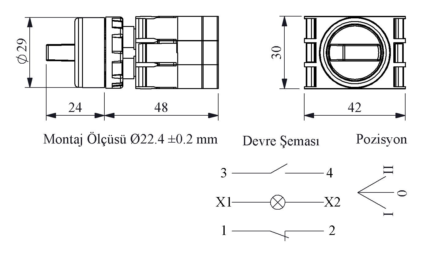 B Serisi Plastik LED'li 1NO+1NC 12-30V AC/DC (II-0-I) 60° Seçici Kalıcı Işıklı Yeşil 22 mm Buton