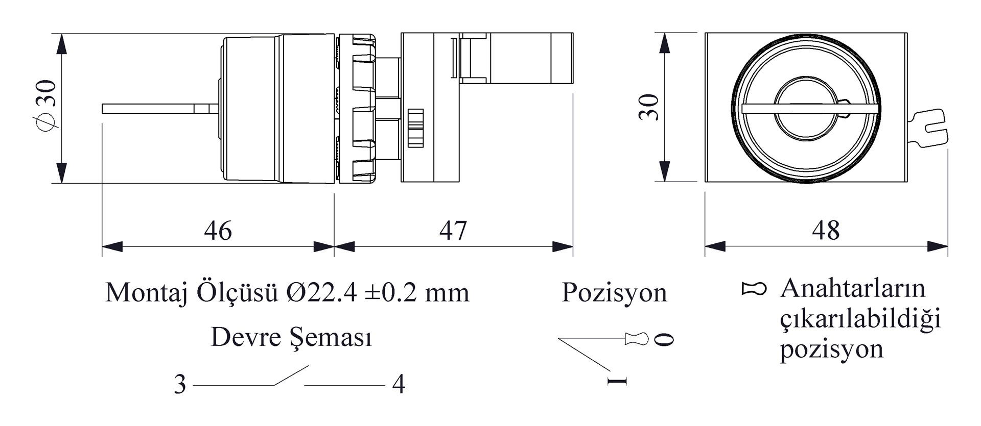 CM Serisi Metal 1NO (0-I) 60° Anahtarlı Kalıcı 0 Pozisyonunda Anahtarı Çıkan 22 mm Buton
