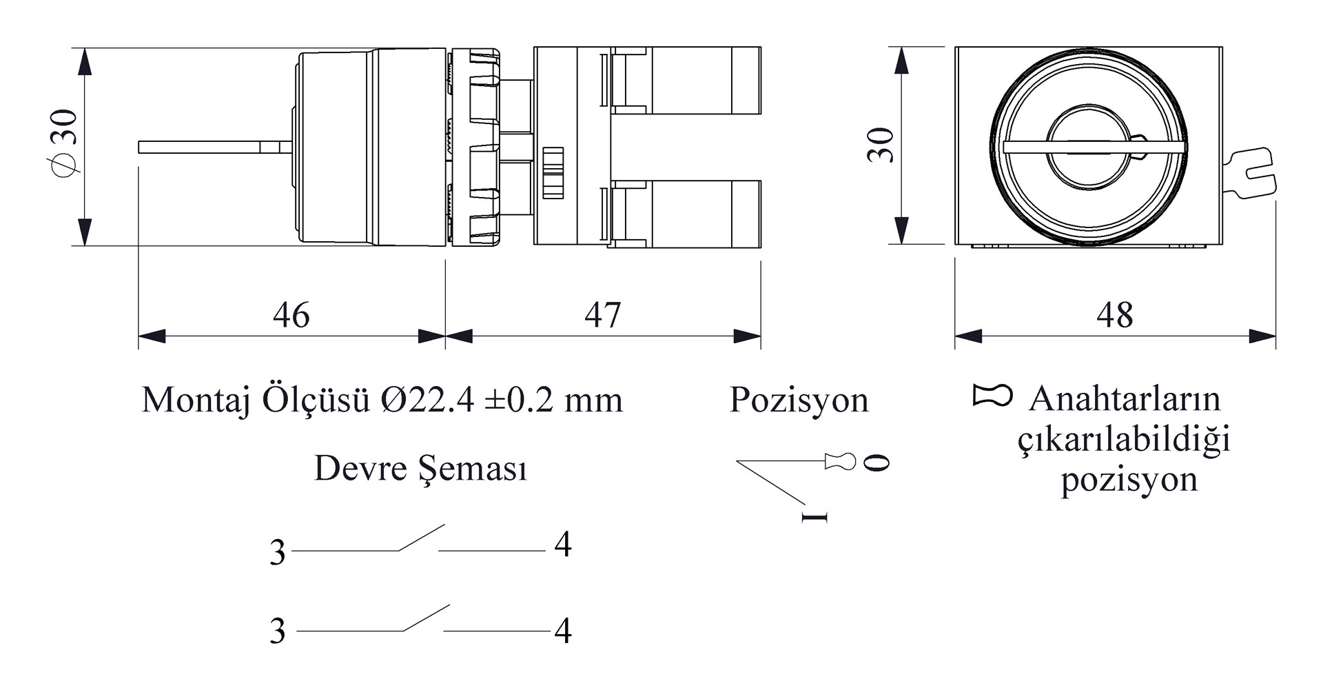 CM Serisi Metal 2NO (0-I) 60° Anahtarlı Kalıcı 0 Pozisyonunda Anahtarı Çıkan  22 mm Buton