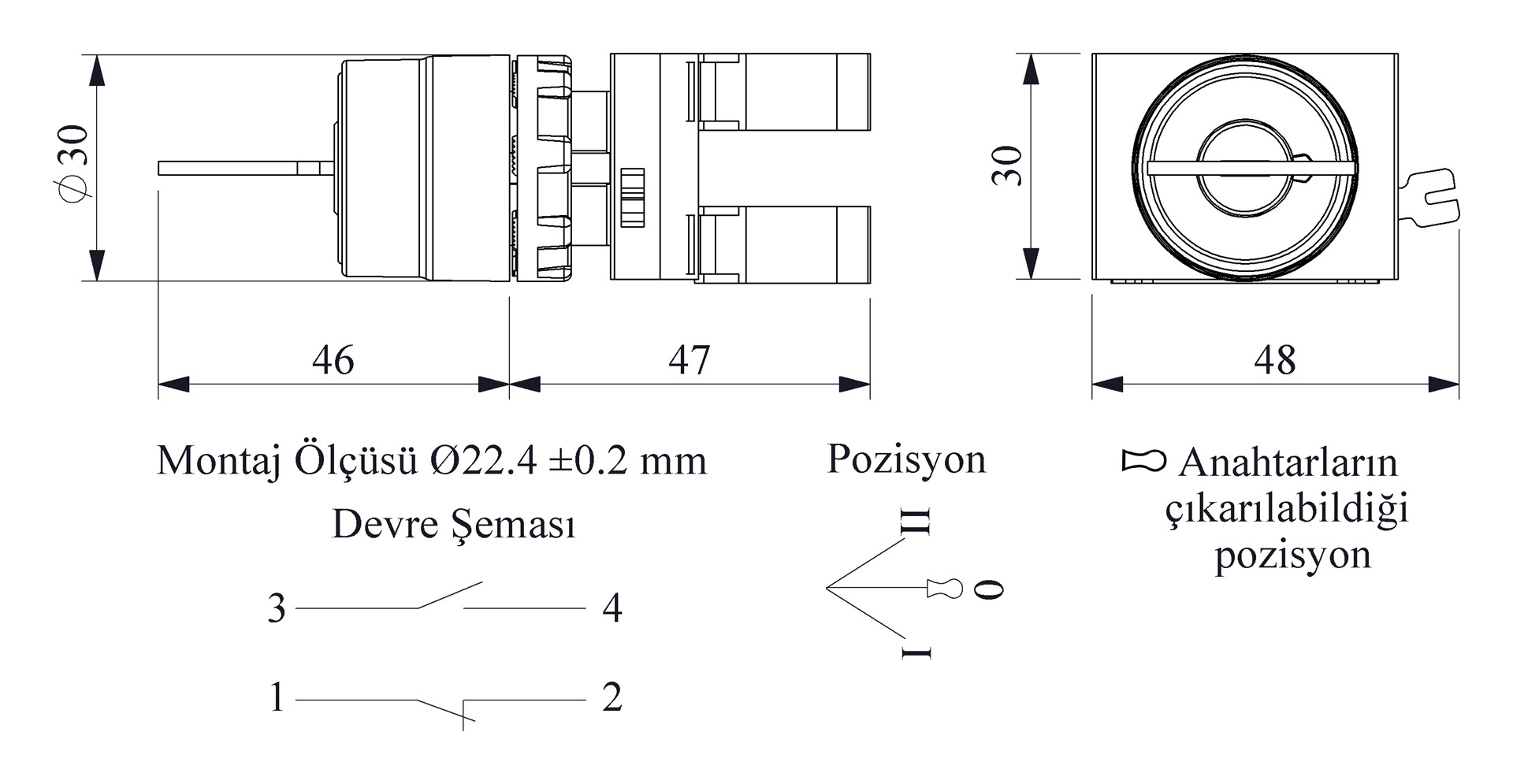 CP Serisi Plastik 1NO+1NC (II-0-I) 60° Anahtarlı Kalıcı 0 Pozisyonunda Anahtarı Çıkan 22 mm Buton