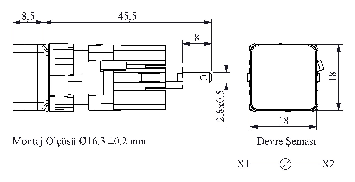 D Serisi Plastik LED'li 12-30V AC/DC Kare Yeşil 16 mm Sinyal