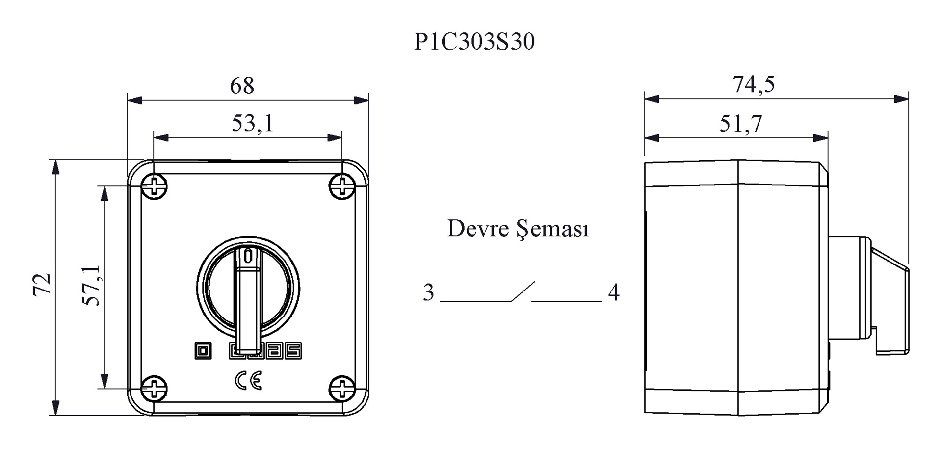 P Serisi Plastik 1 Gözlü CPDS30 + 2*C3CK (NO) Gri-Siyah Kumanda Kutusu