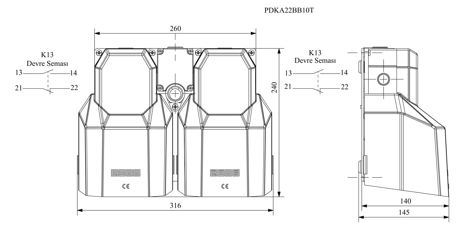 PDK Serisi Metal Korumalı (1NO+1NC)+(1NO+1NC) Taşıma Kol Delikli Çiftli Turuncu Plastik Pedal
