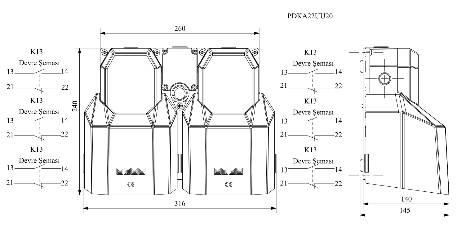 PDK Serisi Metal Korumalı 3*(1NO+1NC)+3*(1NO+1NC) Taşıma Kol Delikli İki Kademeli Çiftli Sarı Plastik Pedal