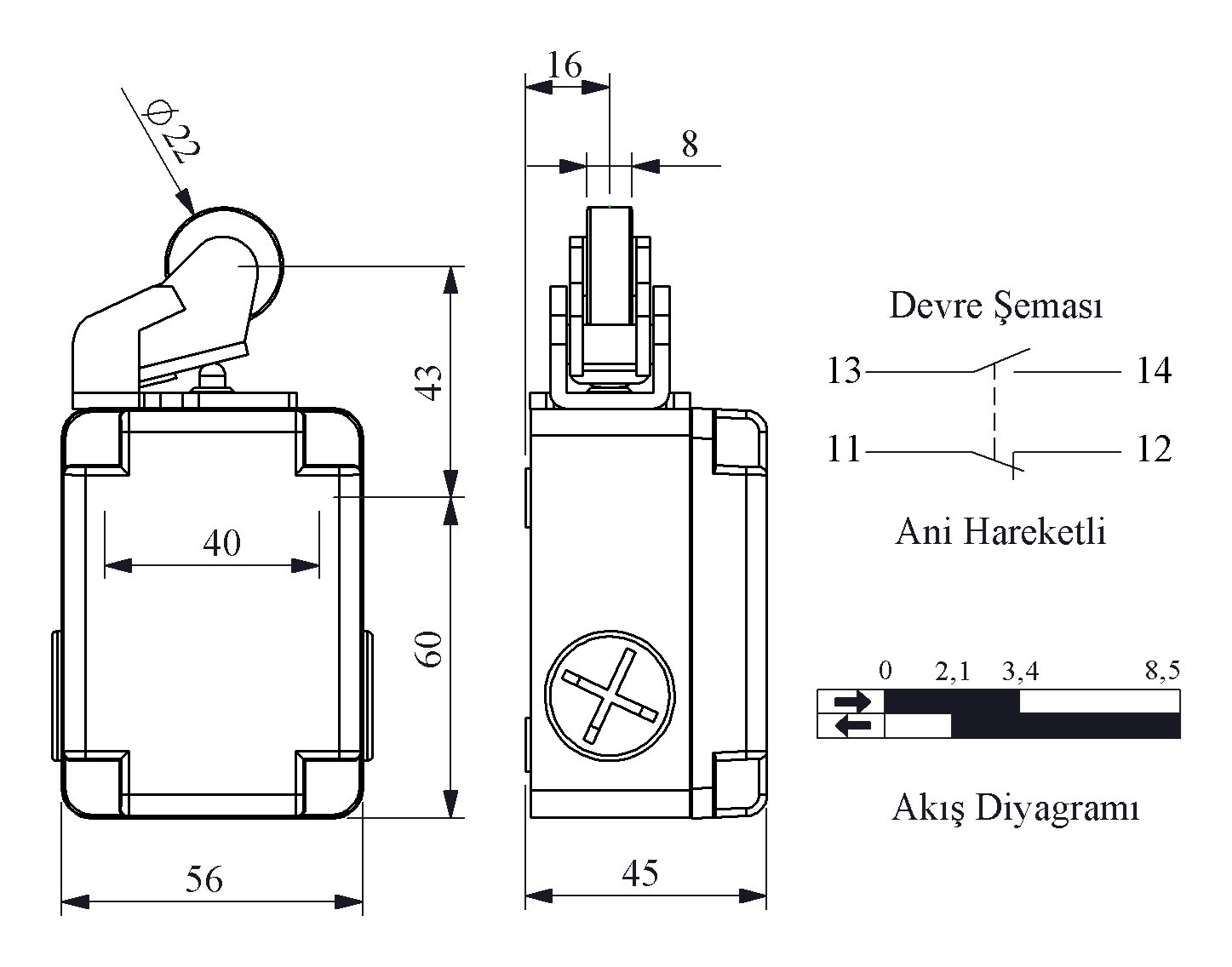L1 Metal Gövde 22 mm Plastik Makaralı Manivela Ani Hareketli 1NO+1NC Sınır Şalter