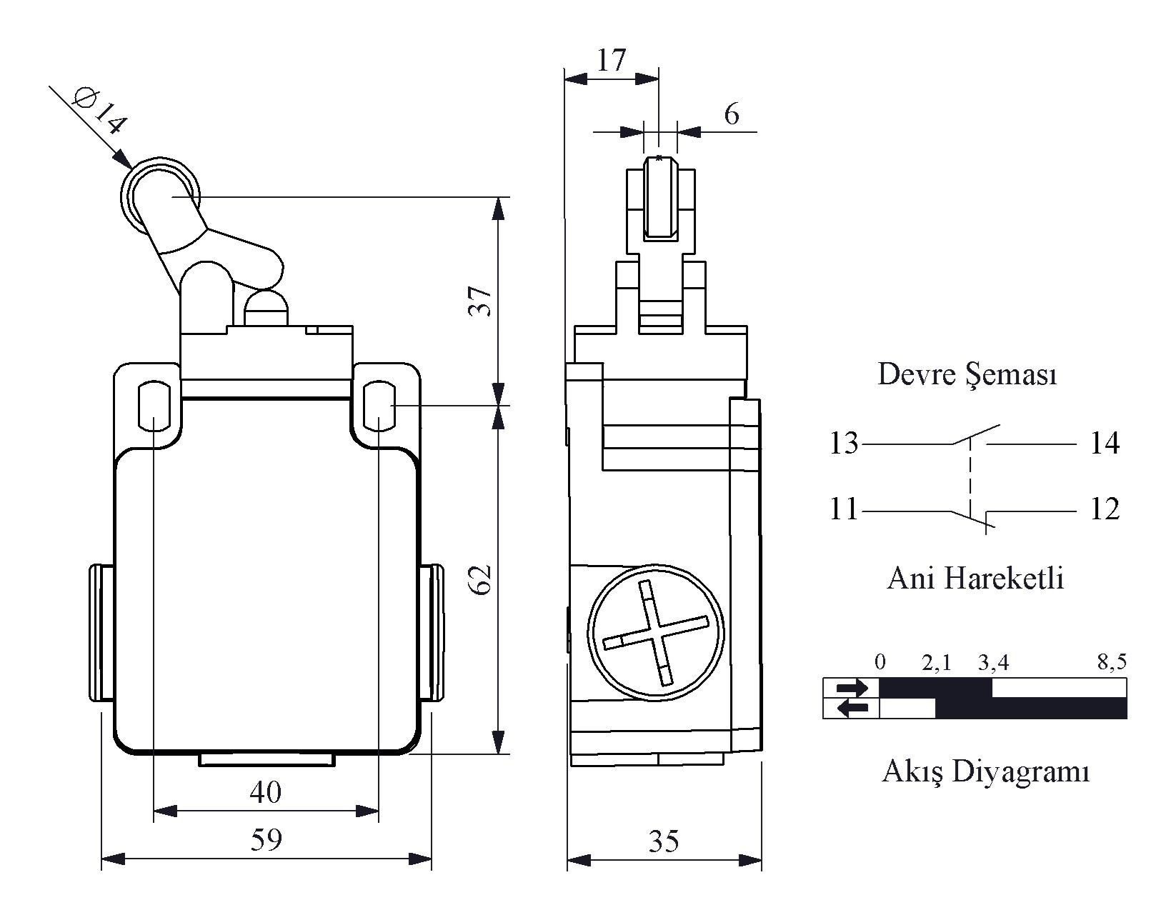 L2 Metal Gövde 14 mm Metal Makaralı Manivela Ani Hareketli 1NO+1NC Sınır Şalter