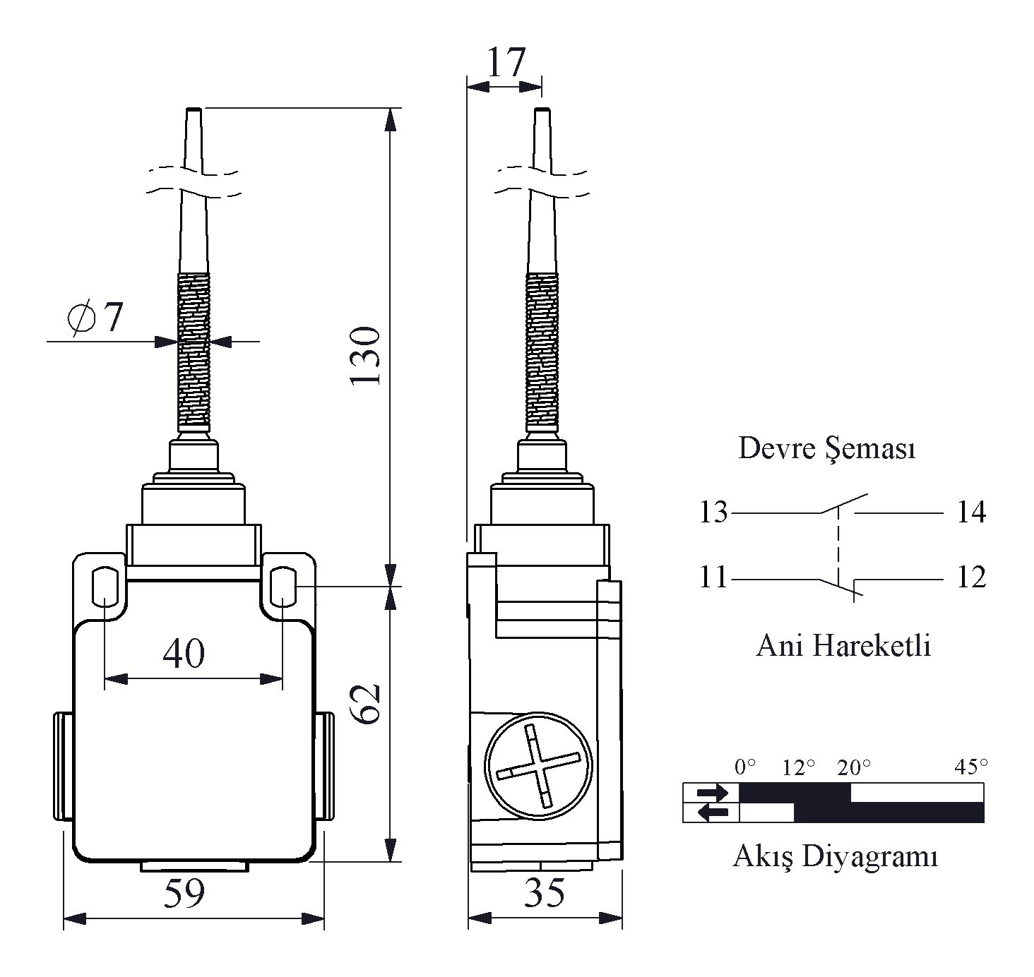 L2 Metal Gövde 7 mm Sivri PLastik Uç Metal Yay Kol Ani Hareketli 1NO+1NC Sınır Şalter