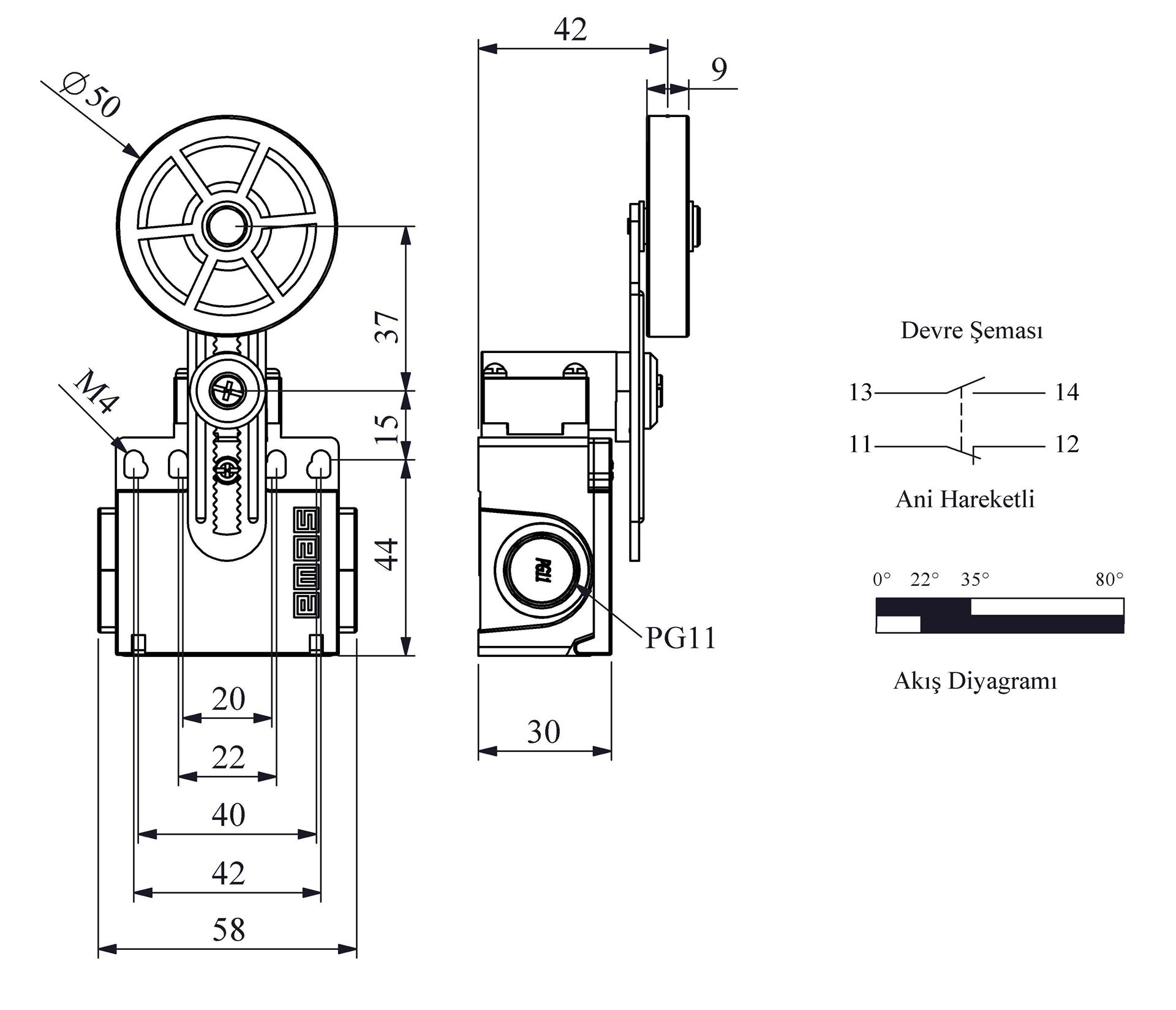L22 Plastik Gövde 50 mm Lastik Ayarlanabilir Kollu Makara Ani Hareketli 1NO+1NC Sınır Şalter
