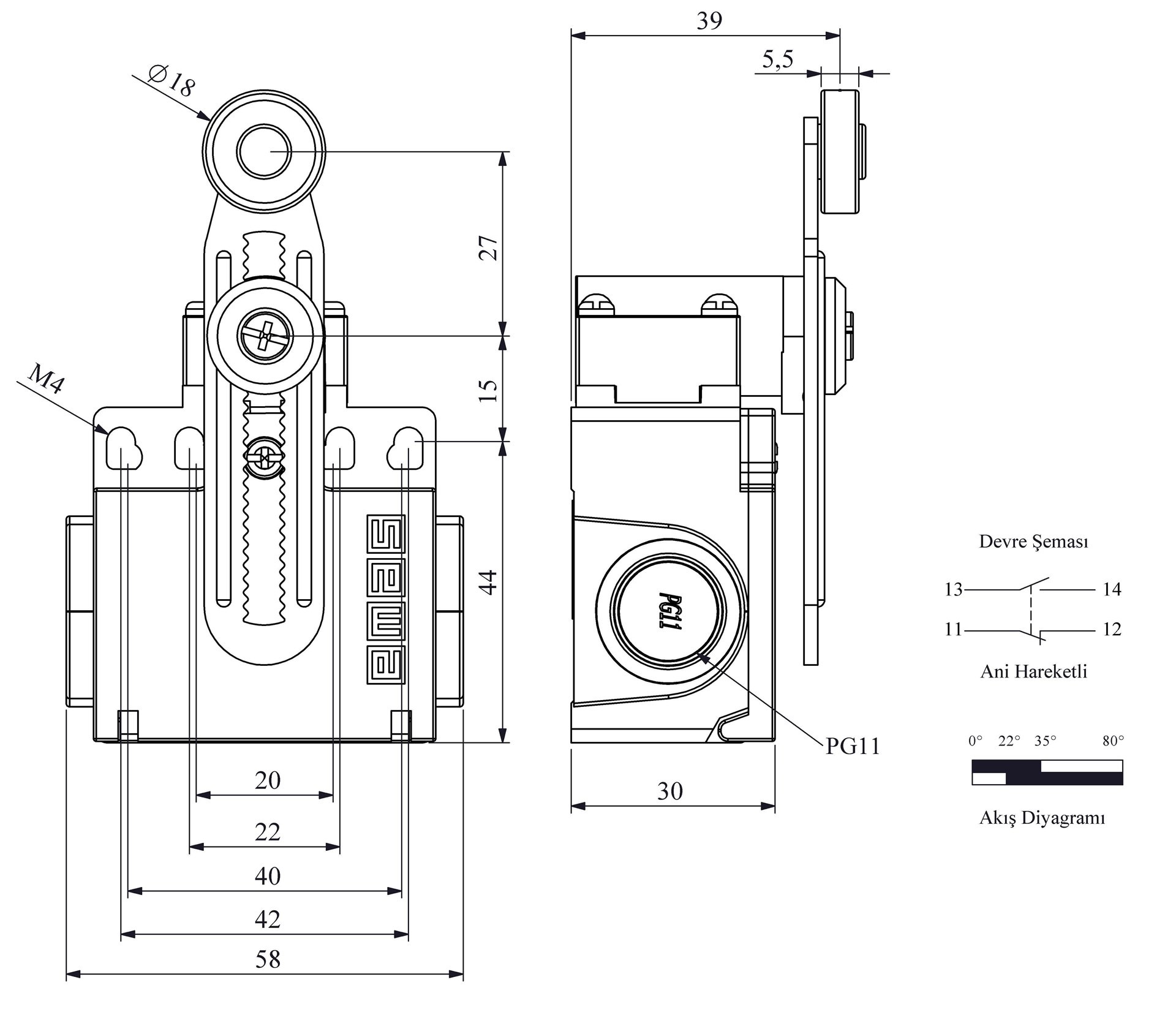 L22 Plastik Gövde 18 mm Metal Ayarlanabilir Kollu Makara Ani Hareketli 1NO+1NC Sınır Şalter