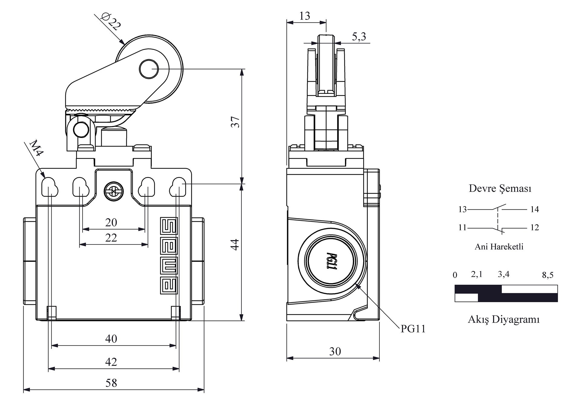 L22 Plastik Gövde 22 mm Metal Makaralı Manivela Ani Hareketli 1NO+1NC Sınır Şalter