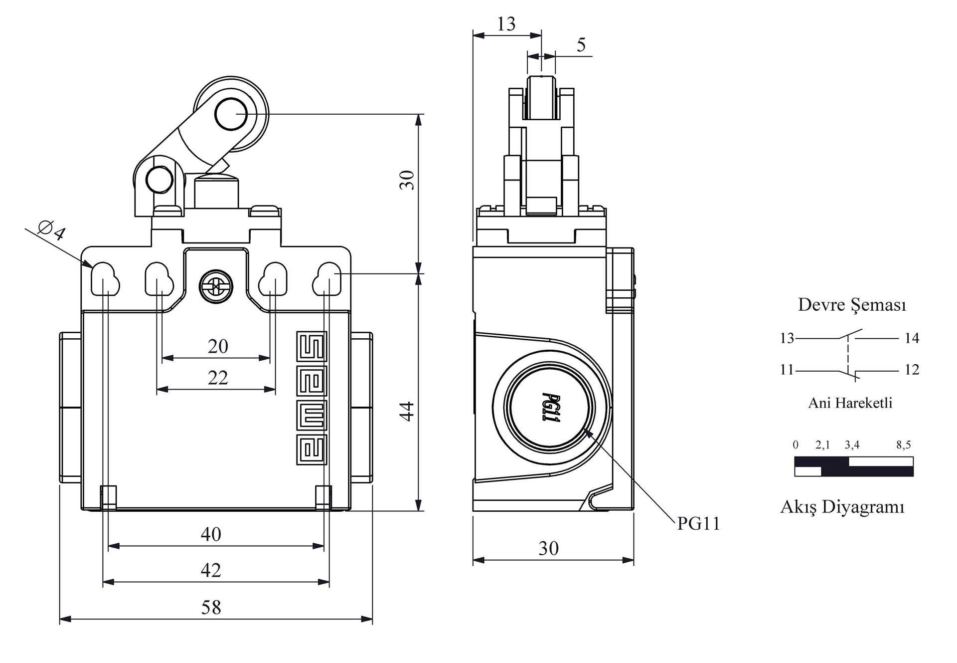 L22 Plastik Gövde 14 mm Metal Makaralı Manivela Ani Hareketli 1NO+1NC Sınır Şalter