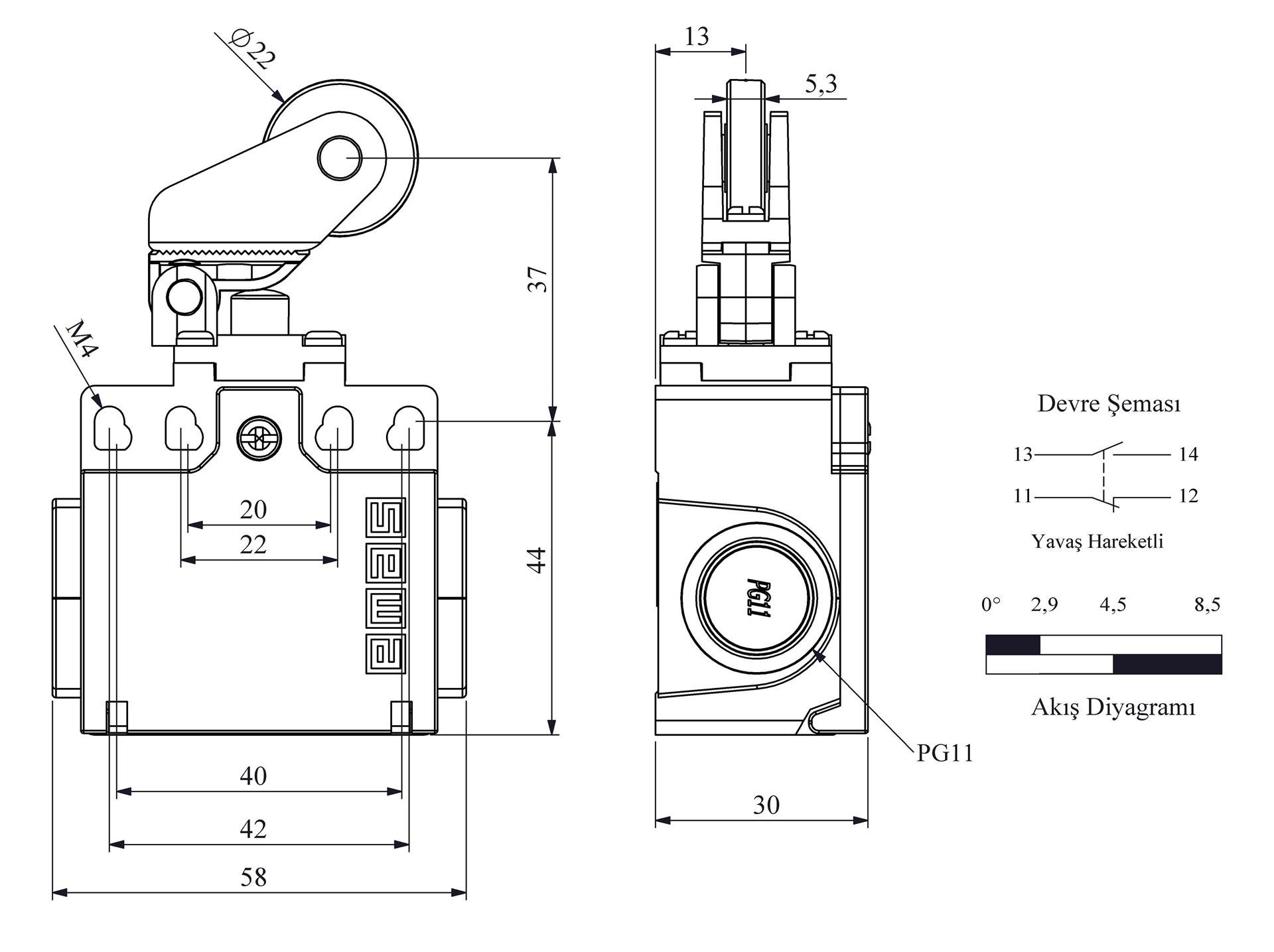 L22 Plastik Gövde 22 mm Metal Makaralı Manivela Yavaş Hareketli 1NO+1NC Sınır Şalter