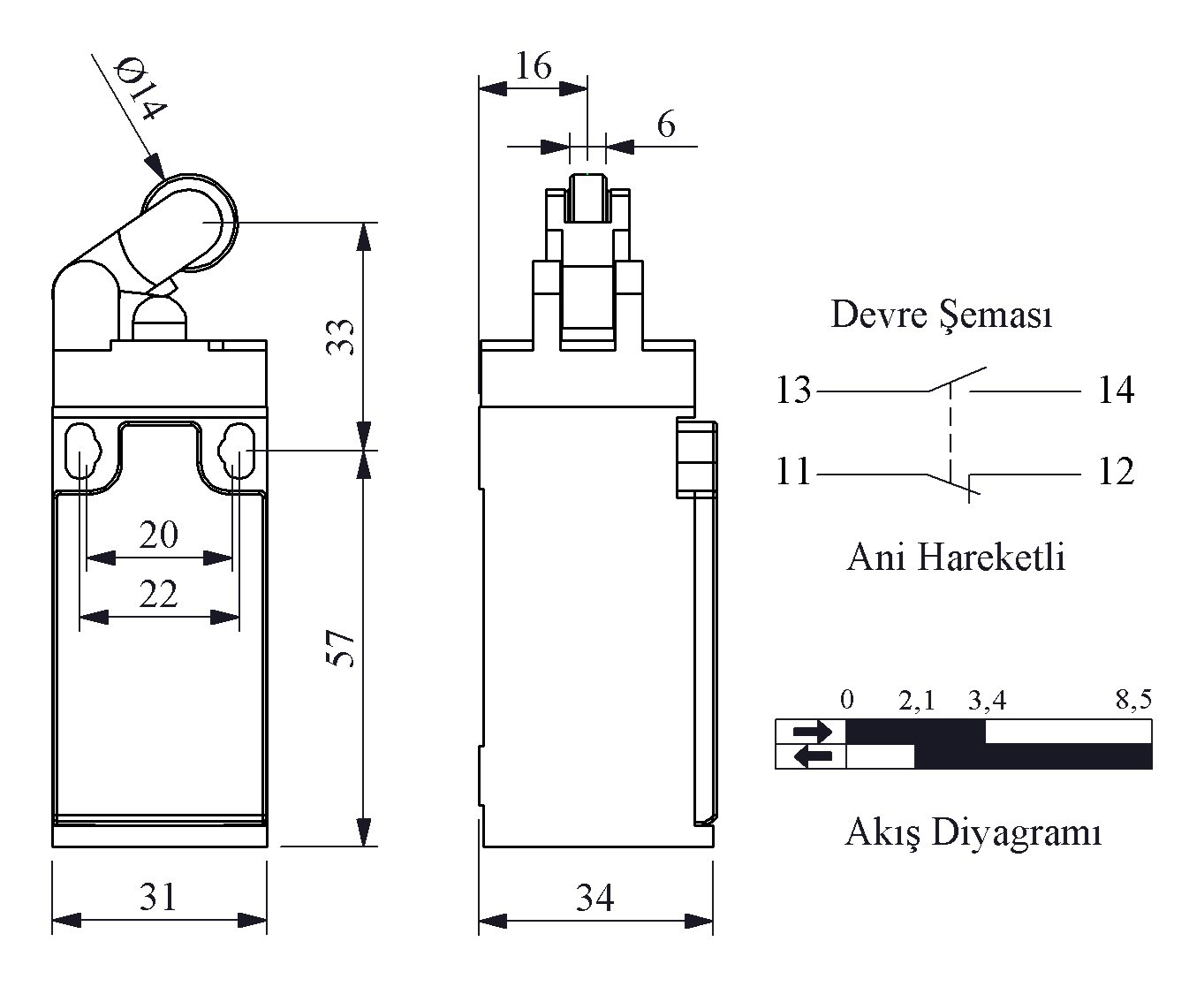 L3 Plastik Gövde 14 mm Metal Makaralı Manivela Ani Hareketli 1NO+1NC Sınır Şalter