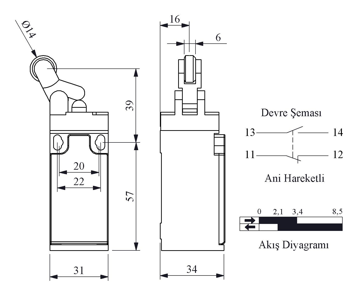 L3 Plastik Gövde 14 mm Metal Makaralı Manivela Ani Hareketli 1NO+1NC Sınır Şalter