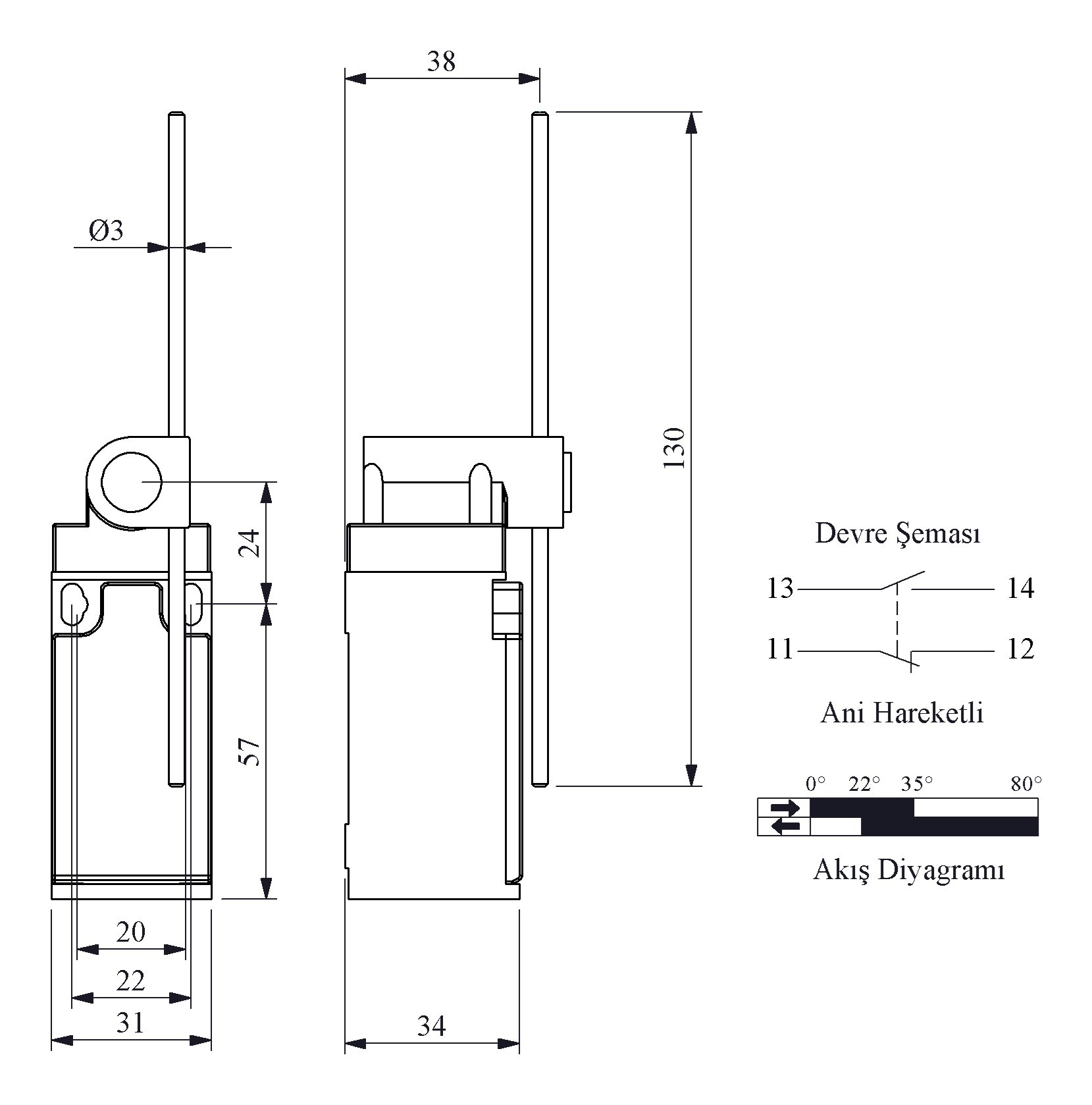 L3 Plastik Gövde 3 mm Metal Rijit Kol Ani Hareketli 1NO+1NC Sınır Şalter