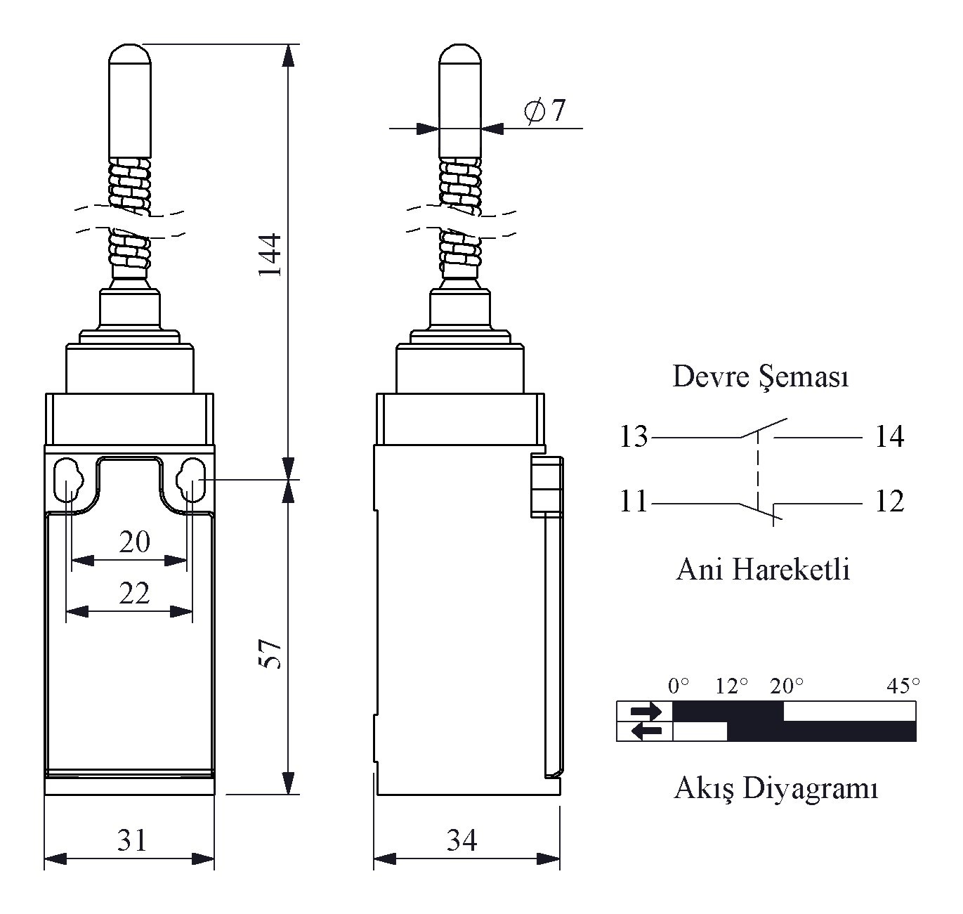 L3 Plastik Gövde 7 mm Küt PLastik Uç Metal Yay Kol Ani Hareketli 1NO+1NC Sınır Şalter