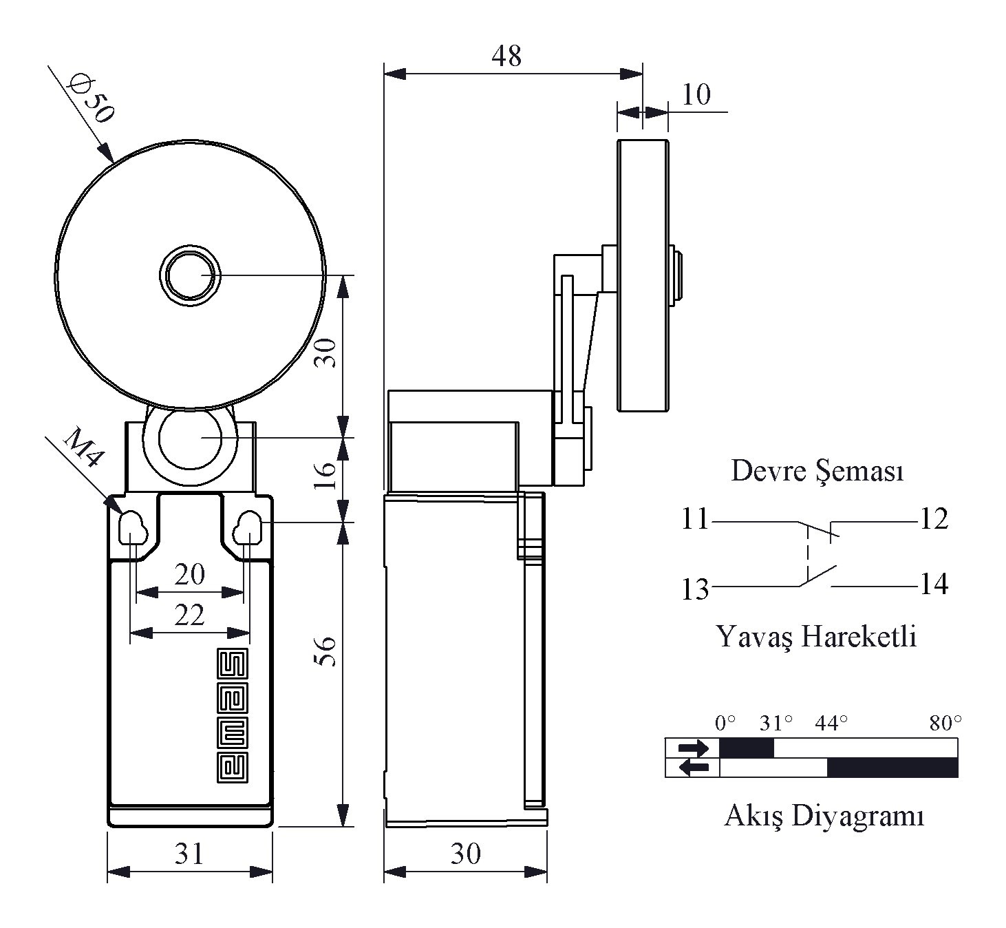 L5 Plastik Gövde 50 mm Lastik Kollu Makara Yavaş Hareketli 1NO+1NC Sınır Şalter