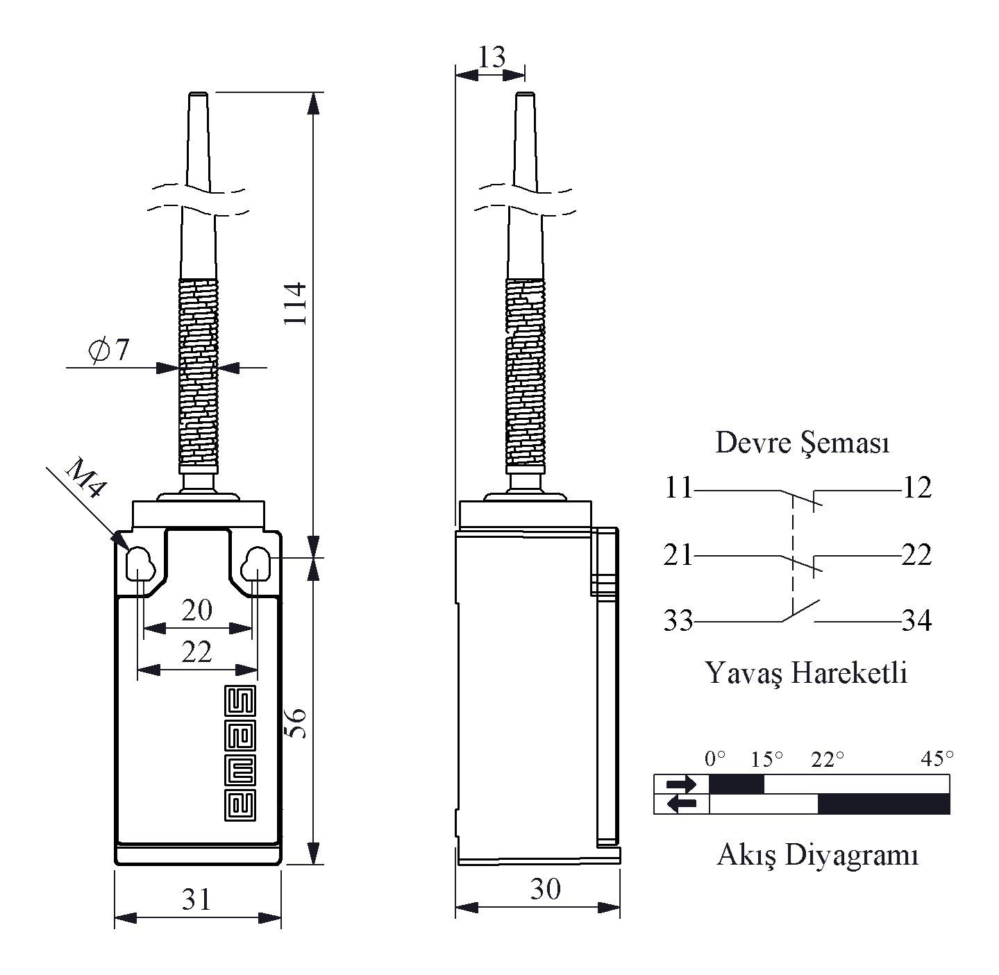 L5 Plastik Gövde 7 mm Sivri PLastik Uç Metal Yay Kol Yavaş Hareketli 1NO+2NC Sınır Şalter