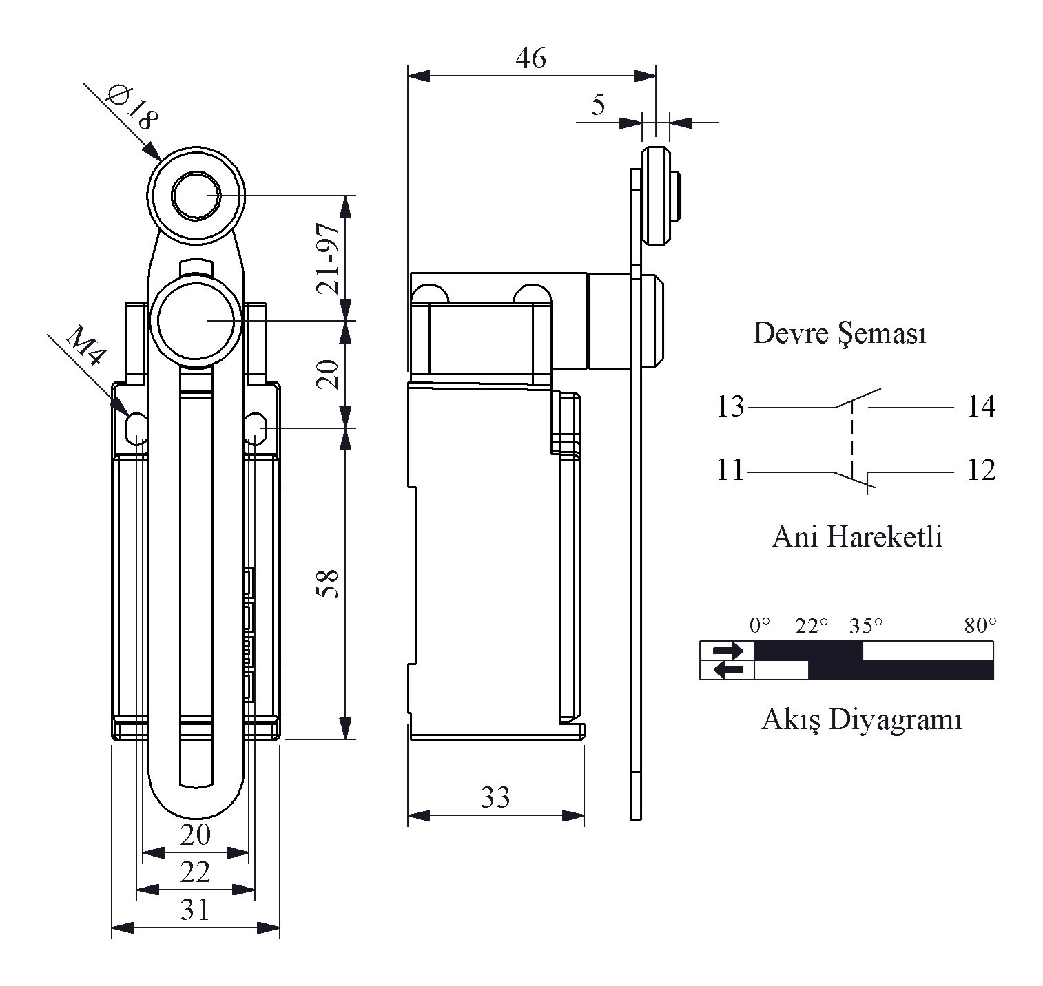 L51 Metal Gövde 18 mm Metal Ayarlanabilir Kollu Makara Ani Hareketli 1NO+1NC Sınır Şalter