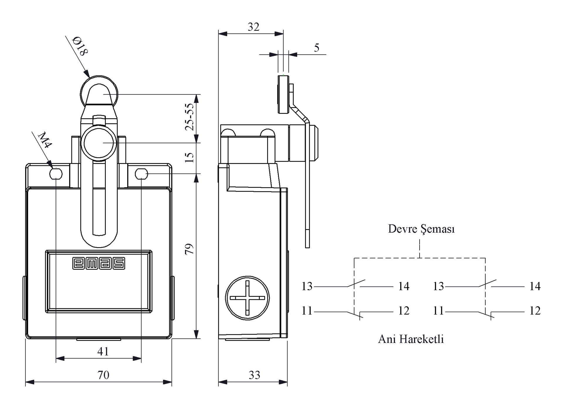 L54 Metal Gövde 18 mm Plastik Ayarlanabilir Kollu Makara Ani Hareketli 2* (1NC+1NO ) Sınır Şalter