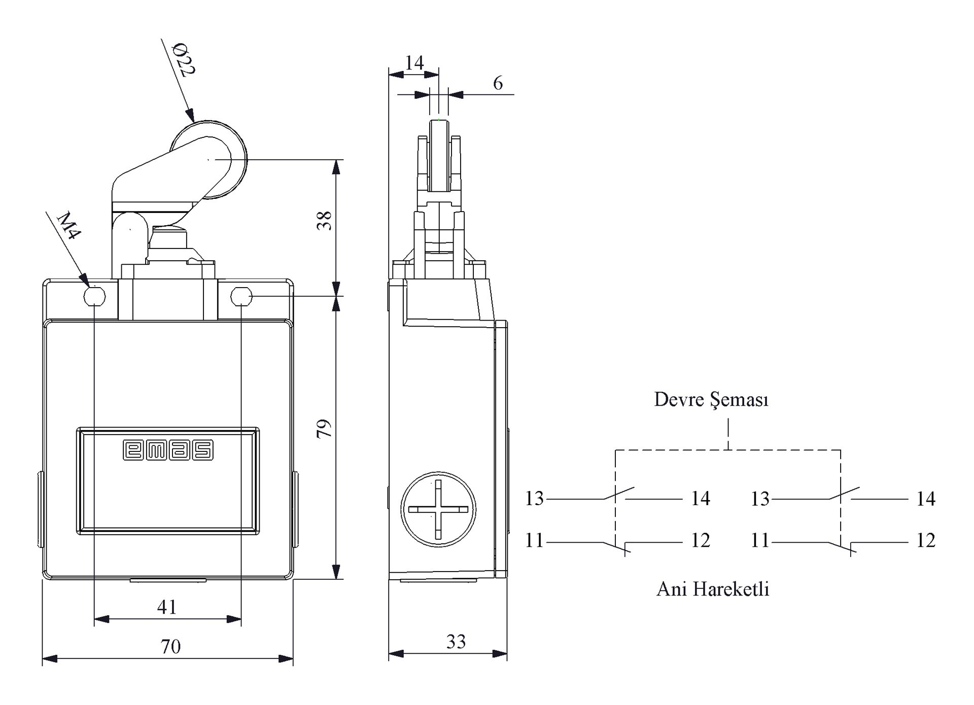 L54 Metal Gövde 22 mm Metal Makaralı Manivela Ani Hareketli 2* (1NC+1NO ) Sınır Şalter
