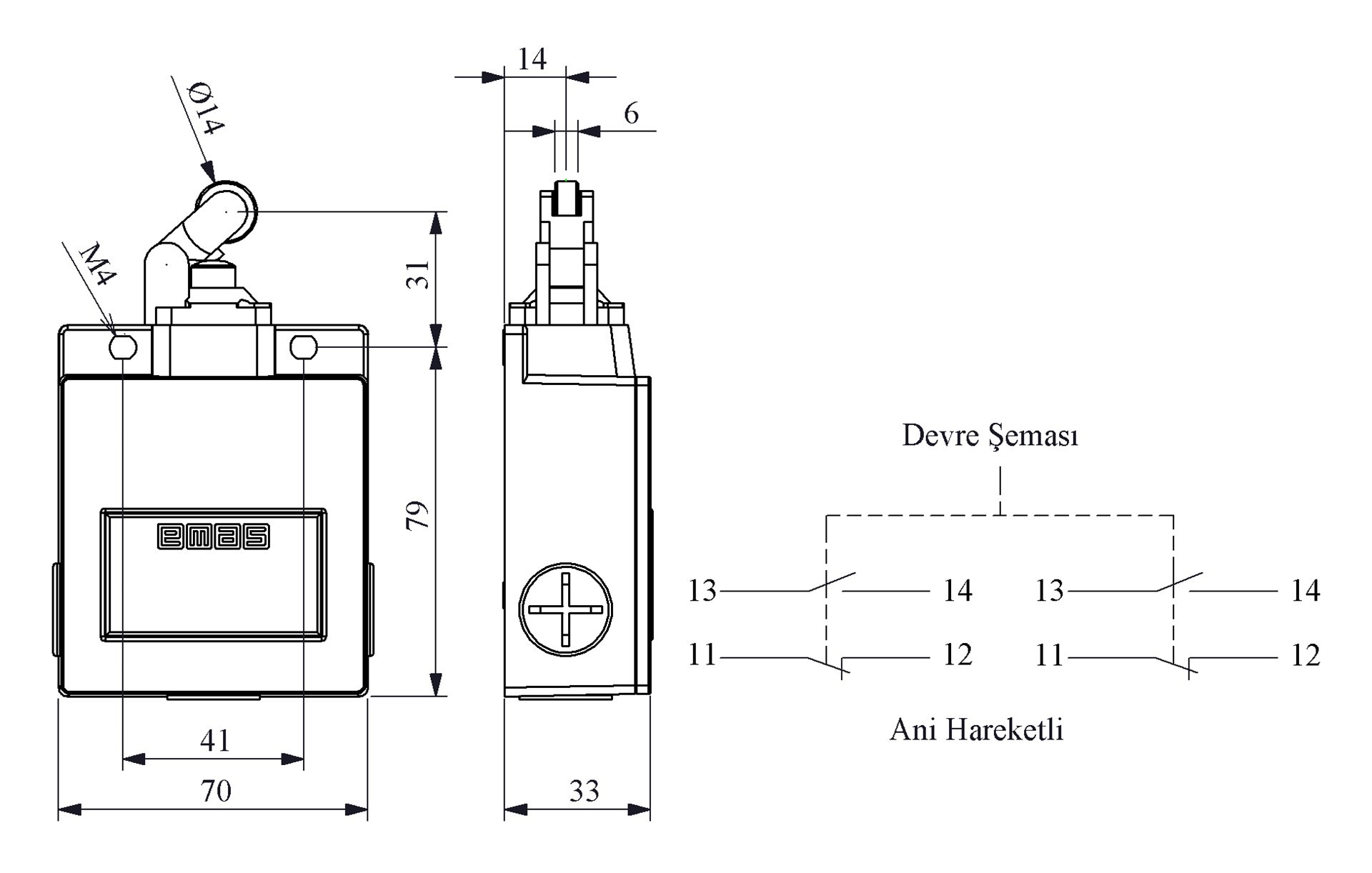 L54 Metal Gövde 14 mm Plastik Makaralı Manivela Ani Hareketli 2* (1NC+1NO ) Sınır Şalter