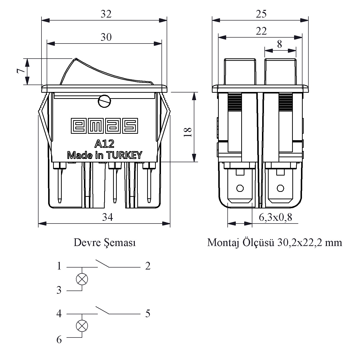 30*22mm Beyaz Gövde 1NO+1NO Işıklı Terminalli (0-I) Baskılı Kırmızı A12 Serisi Anahtar
