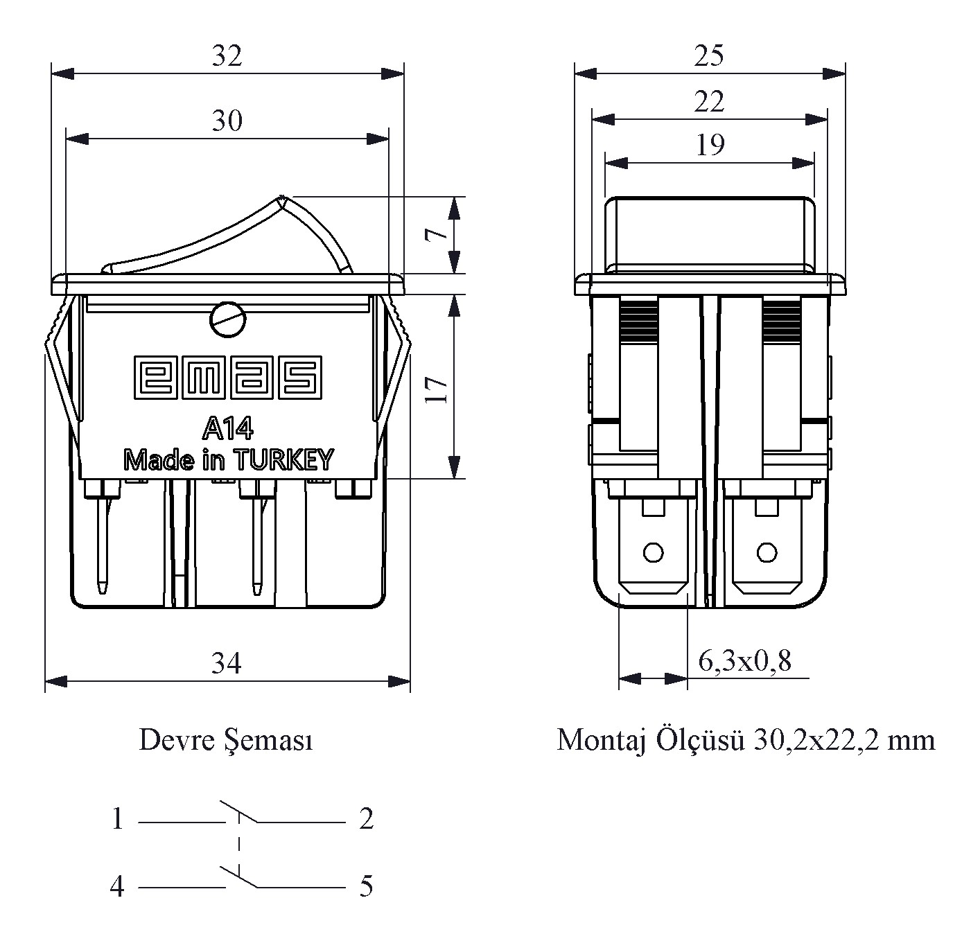 30*22mm Beyaz Gövde 2NO Işıksız Terminalli (0-I) Baskılı Siyah A14 Serisi Anahtar