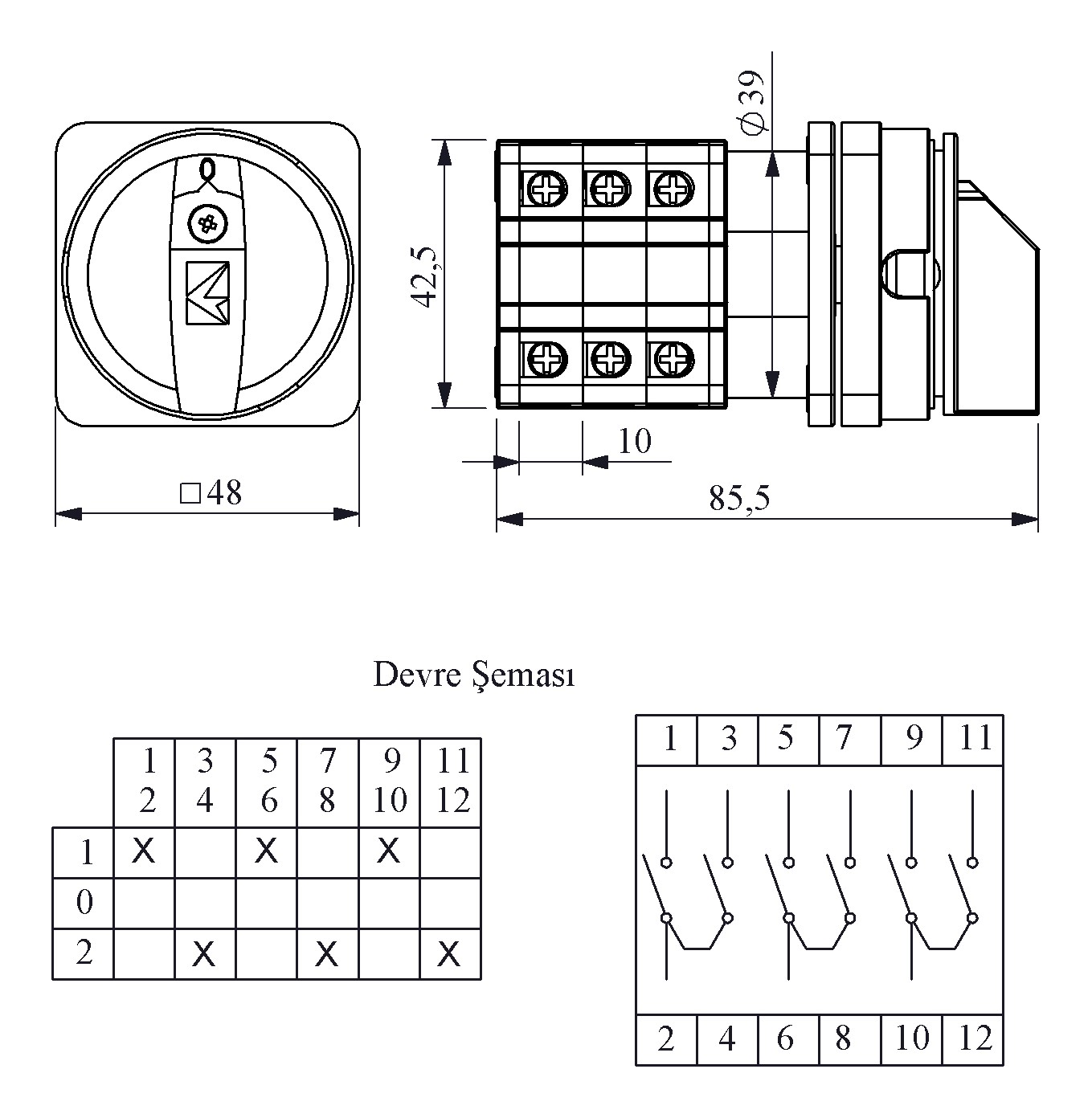 10A Kutup Değiştirici 3 Kutup (1-0-2) 60° Emniyet 48*48 Pako Şalter