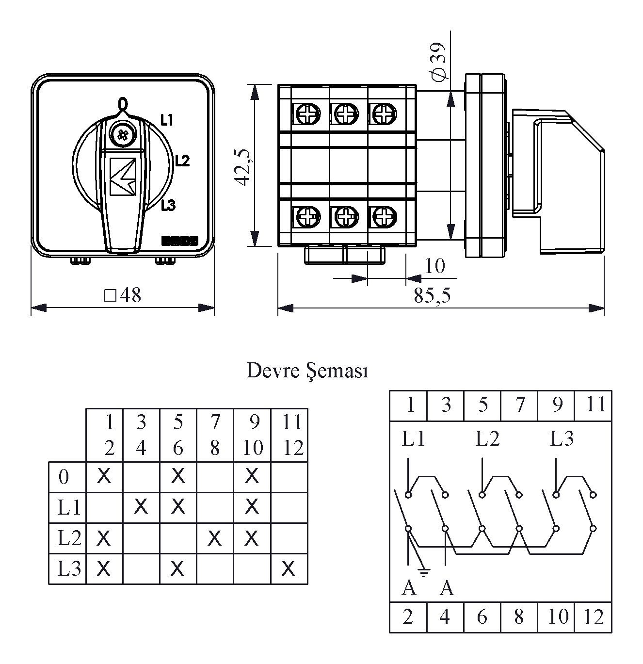 10A Ölçü Komütatörü 3 Faz 45° 4 Pozisyonlu 48*48 Pako Şalter