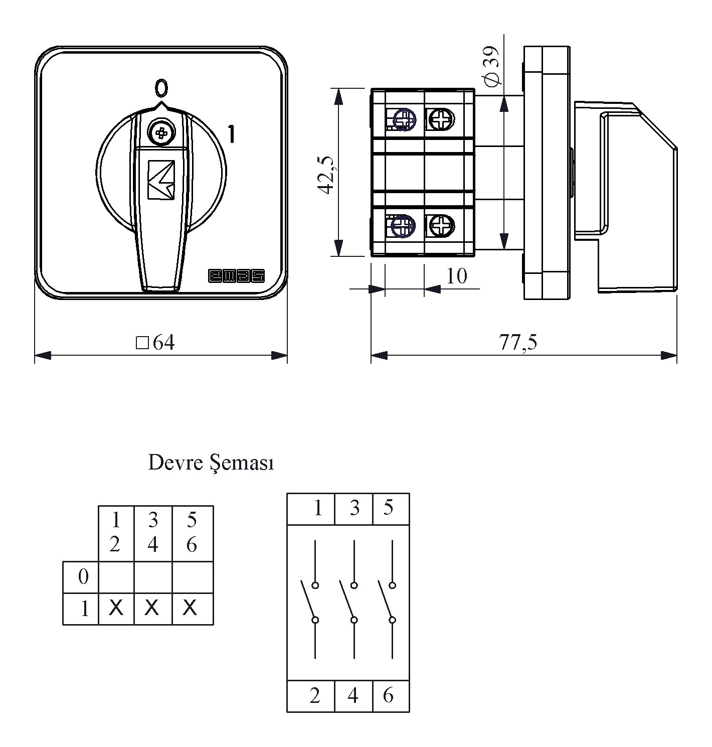 16A On-Off 3 Faz (0-1) 60° 64*64 Pako Şalter