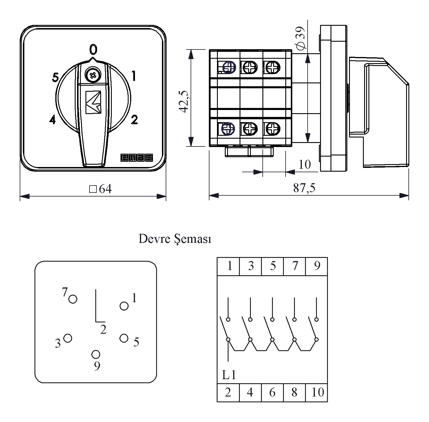 16A 5 Kademeli 1 Kutup (0-5) 60° 64*64 Pako Şalter