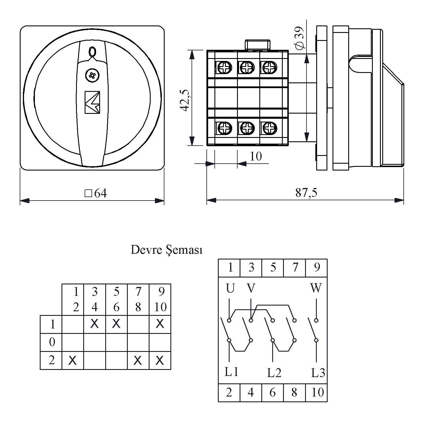 16A Enversör 3 Faz (1-0-2) 60° Emniyet 64*64 Pako Şalter