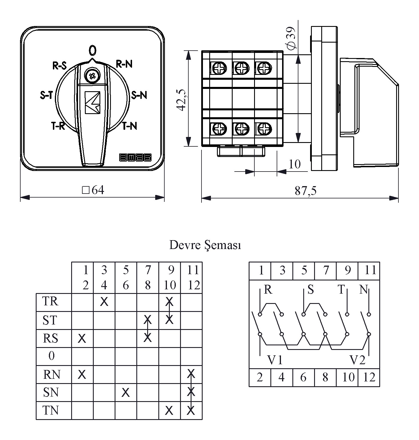 16A Ölçü Komütatörü 3 Faz 45° 7 Pozisyonlu 64*64 Pako Şalter