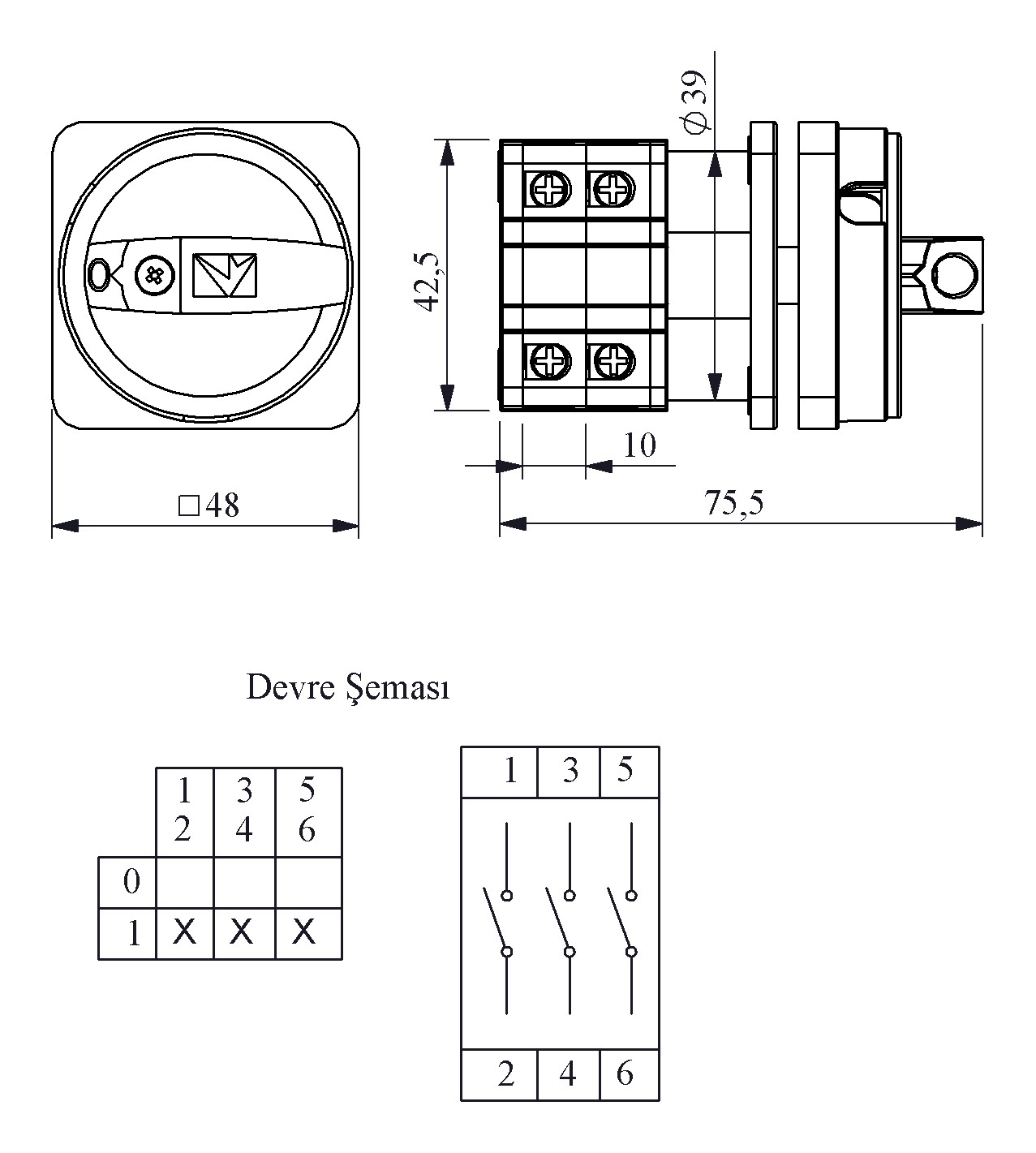 20A On-Off 3 Faz (0-1) 90° Emniyet 48*48 Pako Şalter