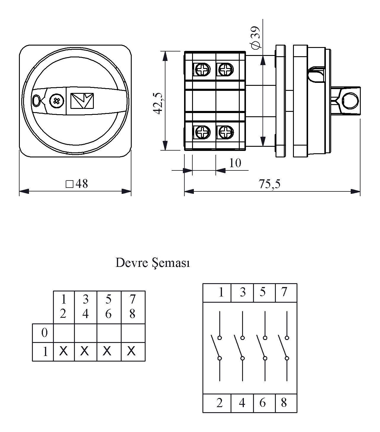 20A On-Off 4 Faz (0-1) 90° Emniyet 48*48 Pako Şalter