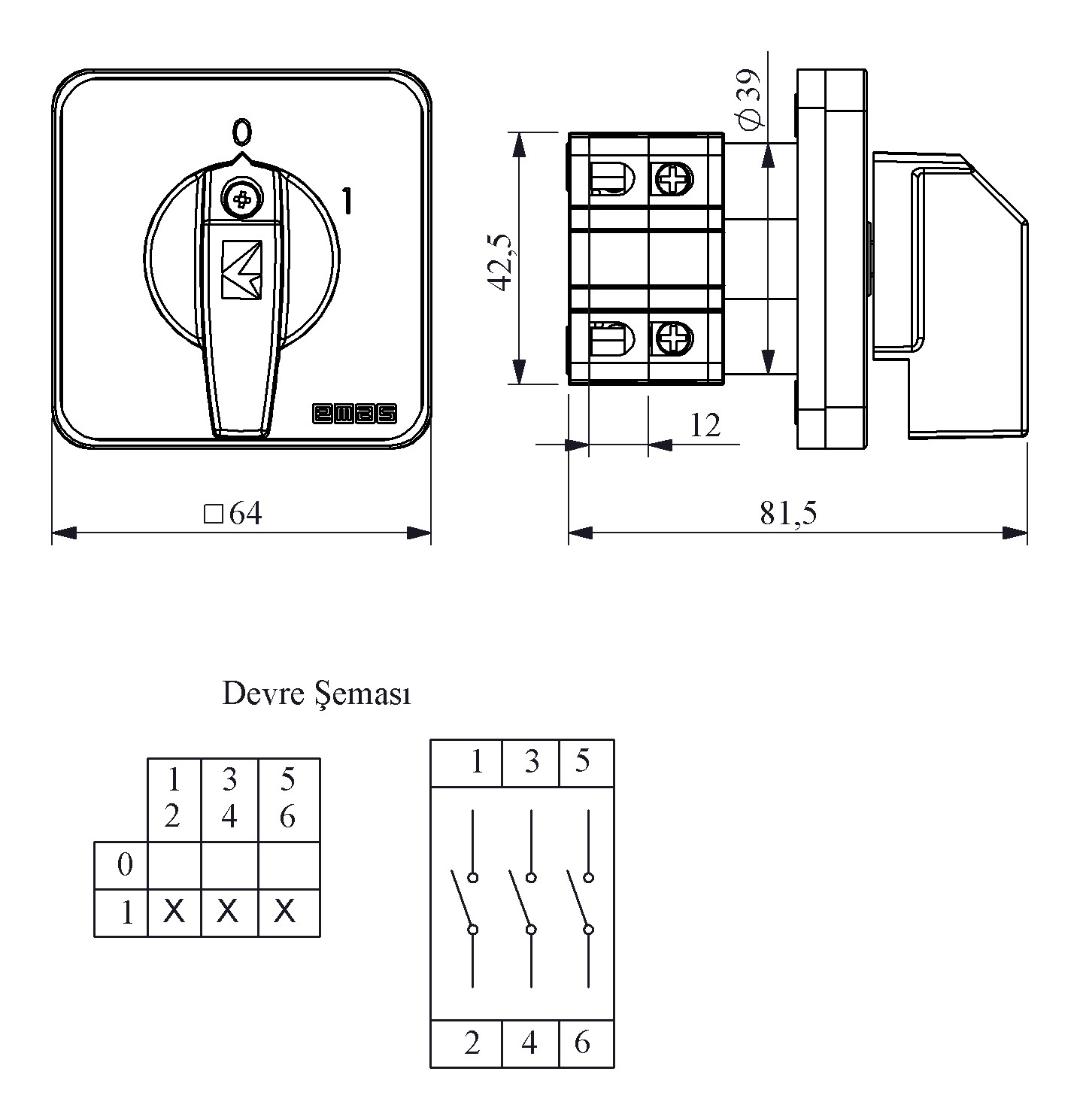 25A On-Off 3 Faz (0-1) 60° 64*64 Pako Şalter