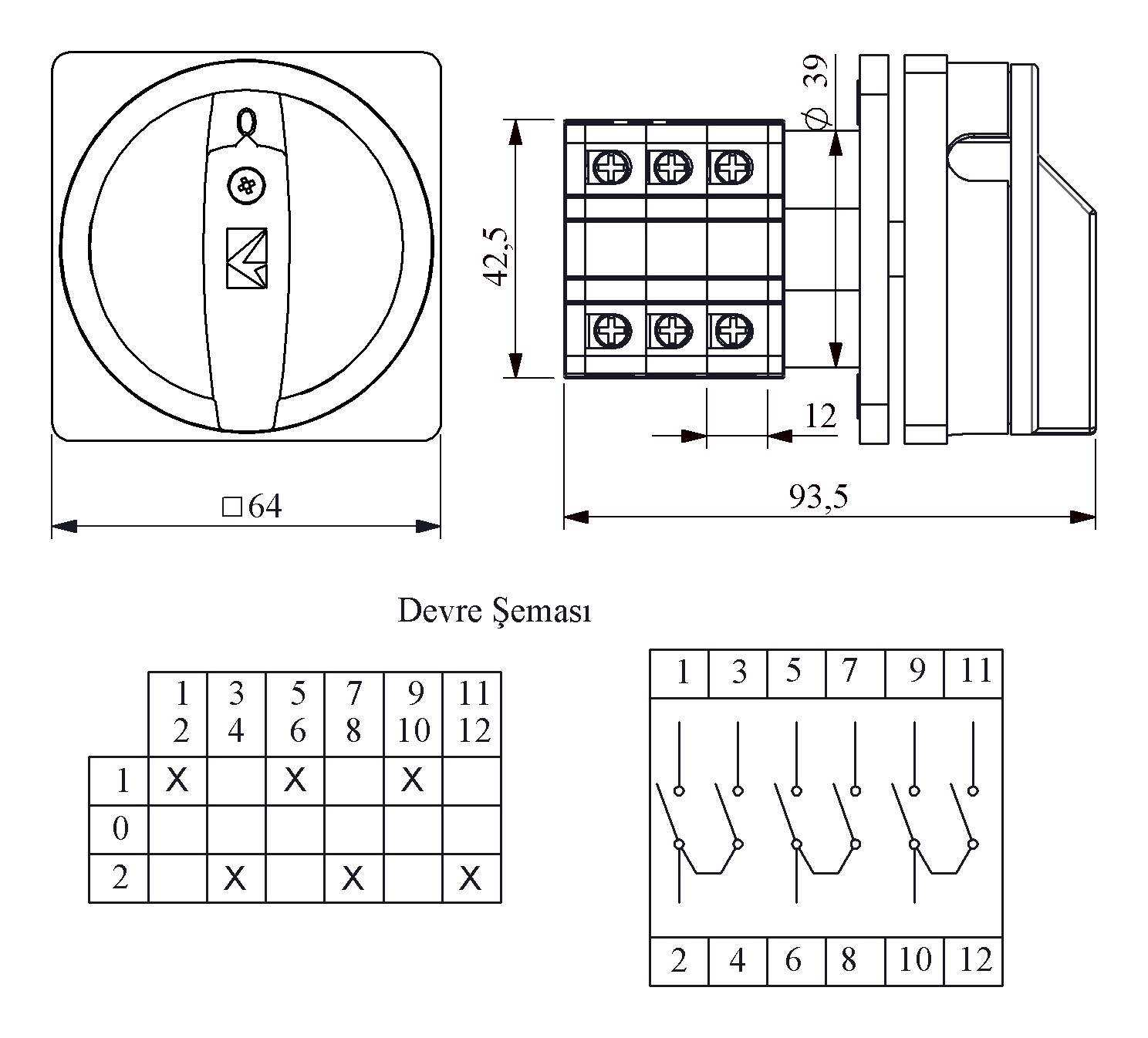 25A Kutup Değiştirici 3 Kutup (1-0-2) 60° Emniyet 64*64 Pako Şalter