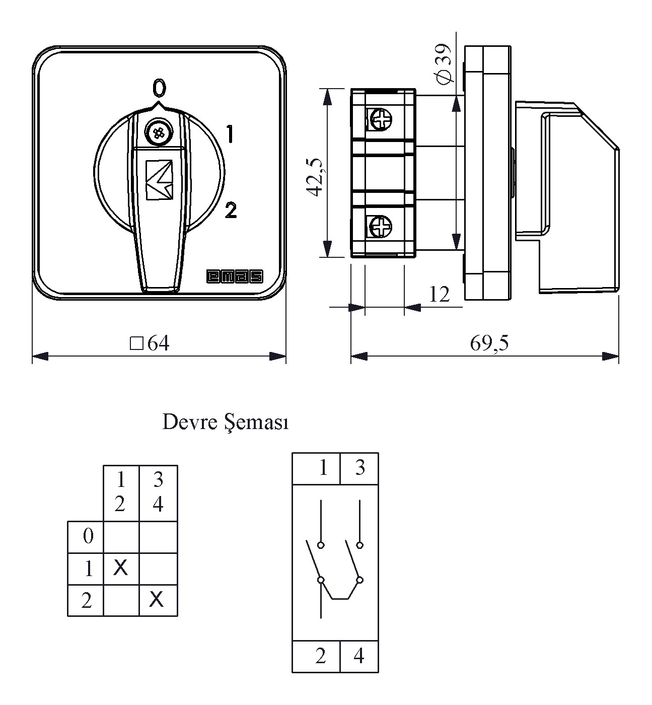 25A 2 Kademeli 1 Kutup (0-1-2) 60° 64*64 Pako Şalter