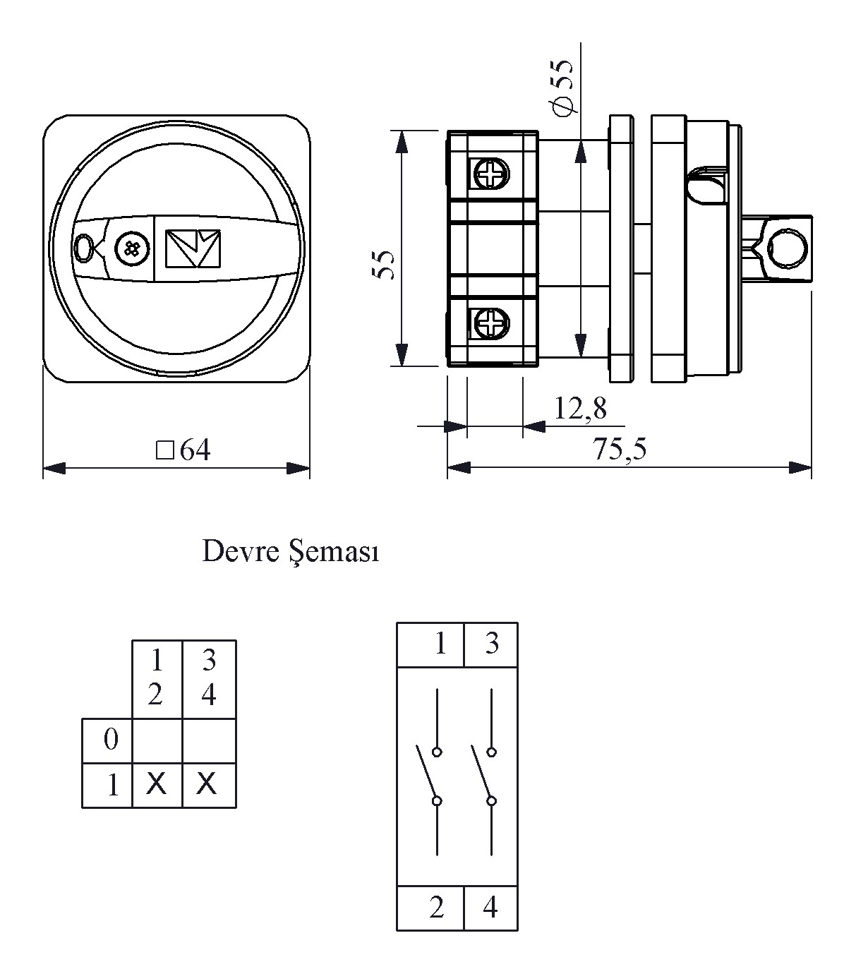 32A On-Off 2 Faz (0-1) 90° Emniyet 64*64 Pako Şalter