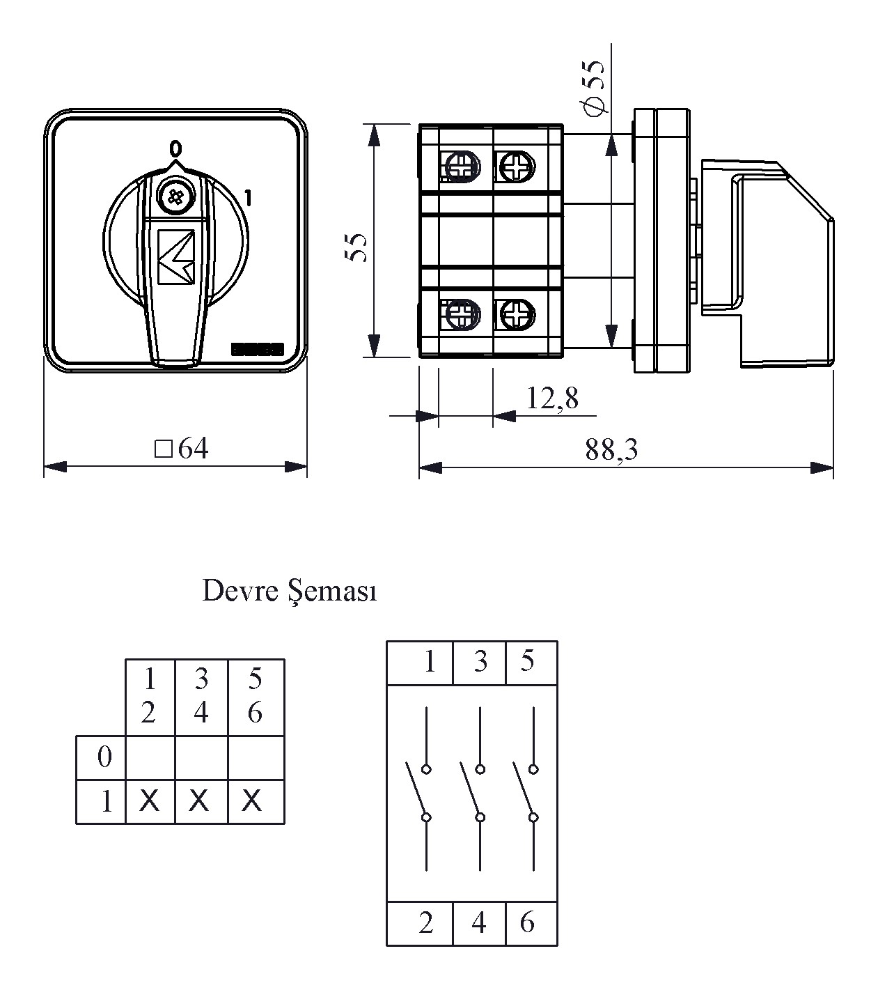32A On-Off 3 Faz (0-1) 60° 64*64 Pako Şalter